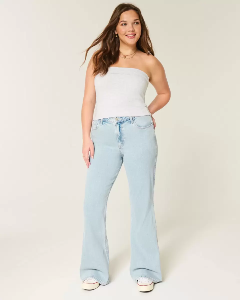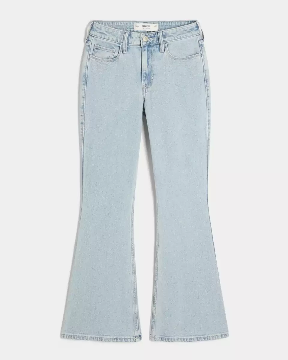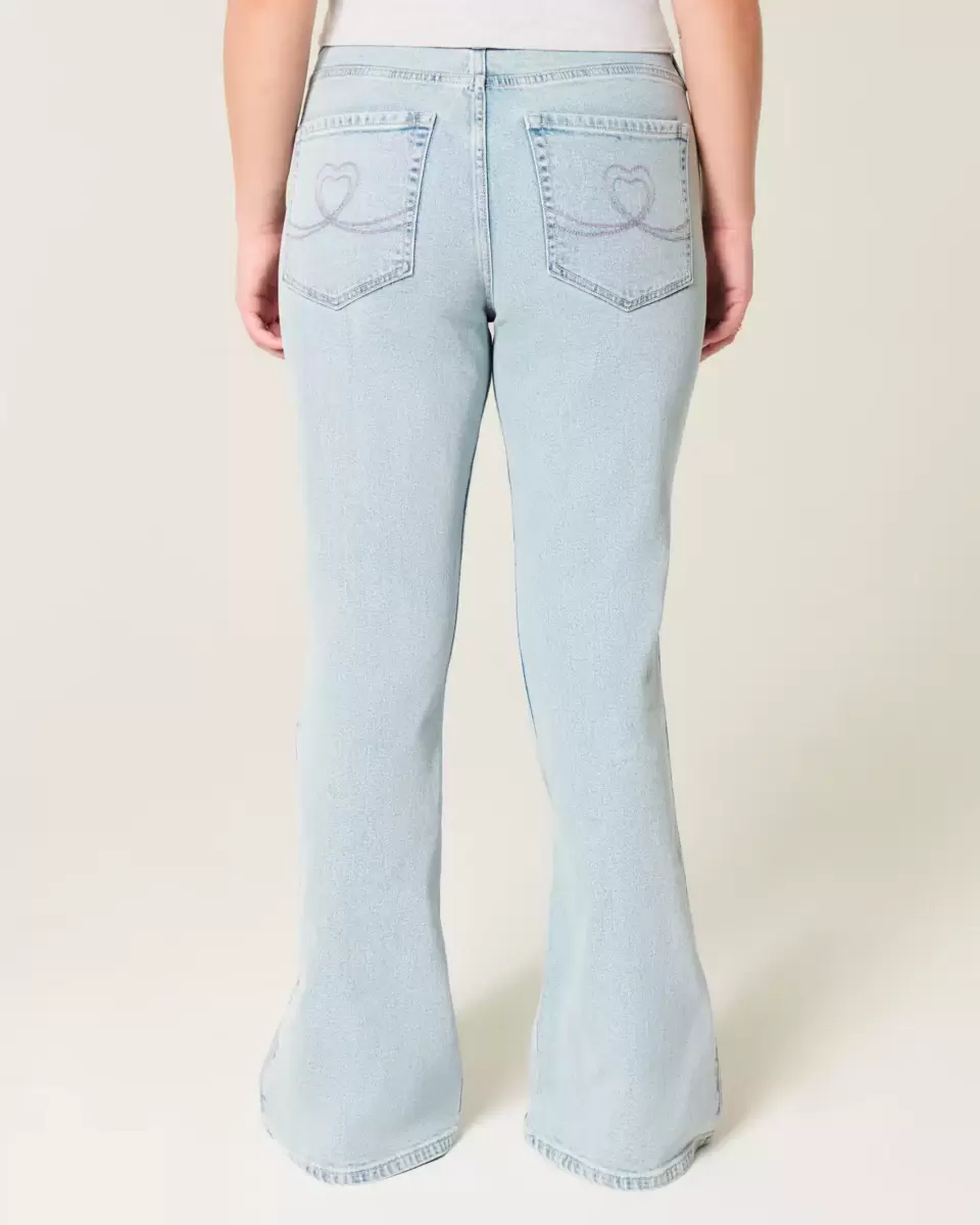 Comfortable jeans made with Vintage Stretch denim, designed with a flattering high-rise waist, slim leg and flared hem. Light wash, embroidered heart detailing at back pocket. Imported.