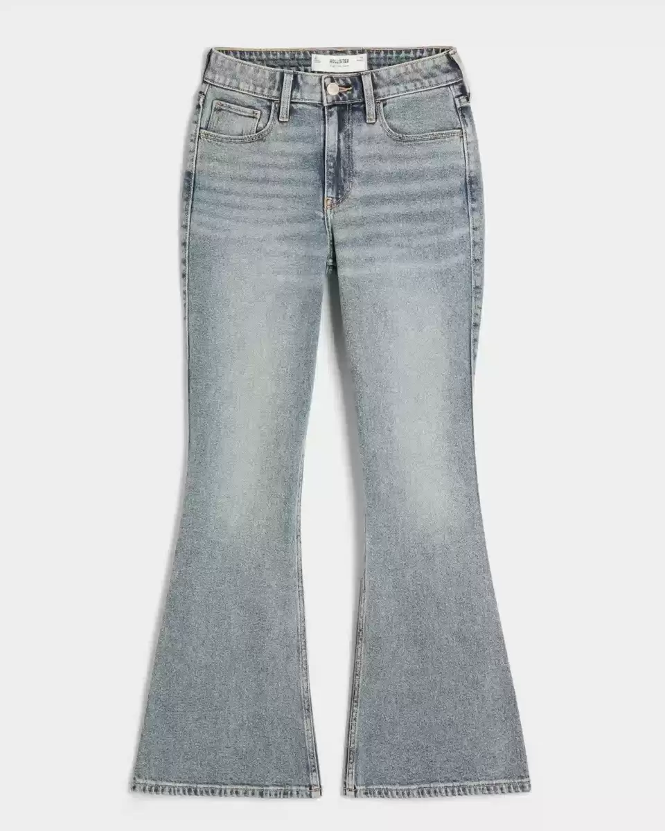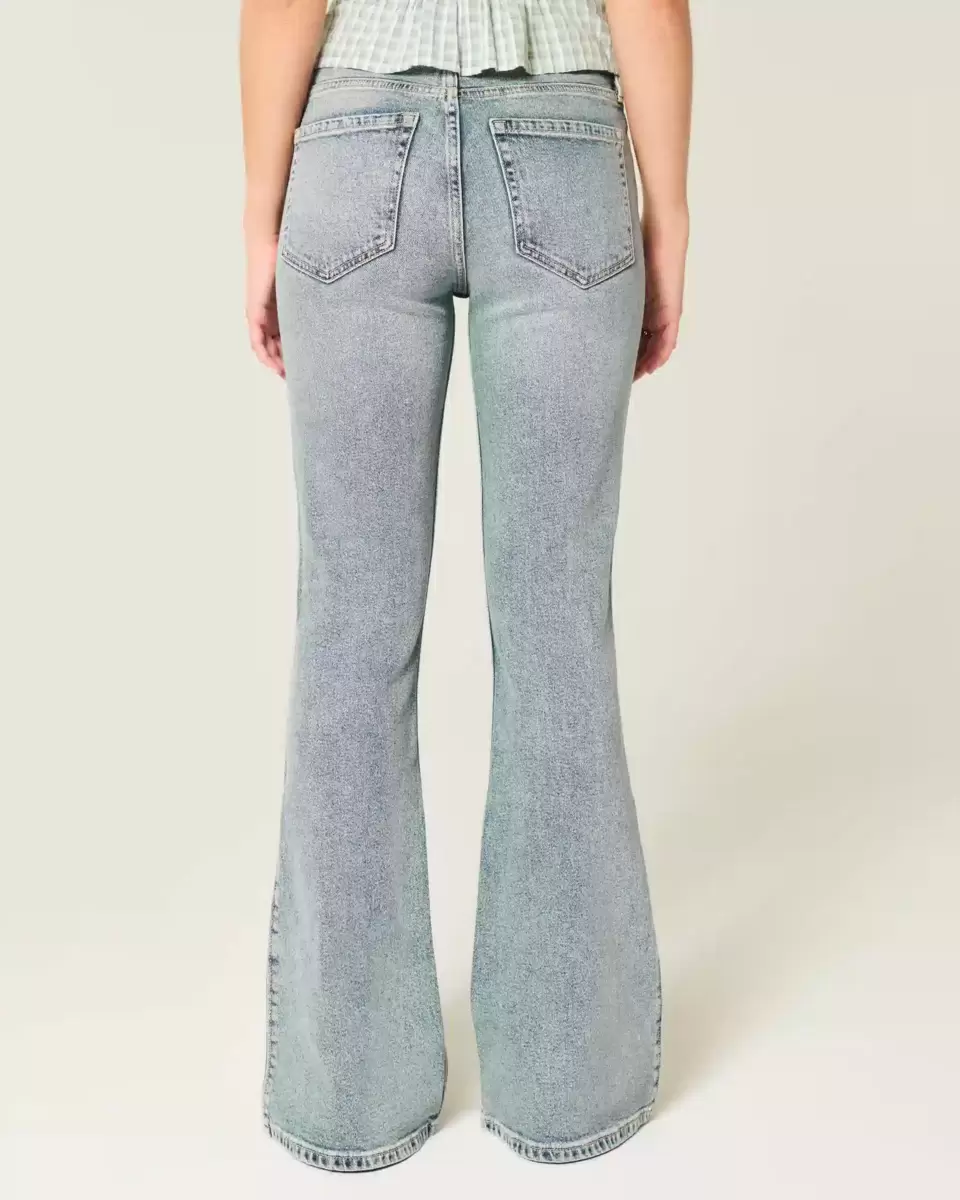Comfortable denim jeans in a medium wash, designed with a flattering high-rise waist, slim leg and flared hem. Fading, whiskering, Vintage Stretch denim. Imported.