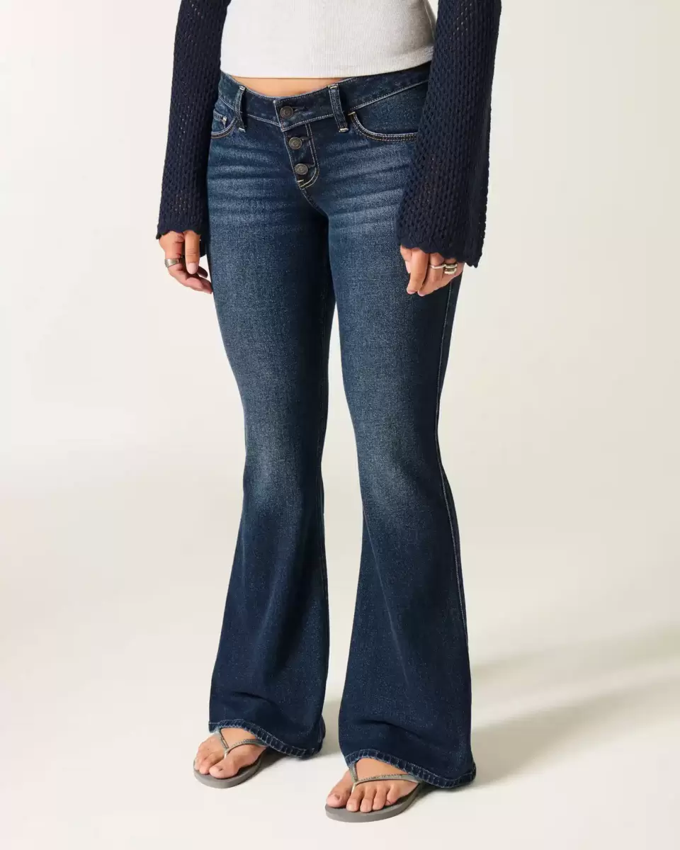Comfortable jeans in Vintage Stretch denim, designed with an ultra low-rise waist and flared hem. Dark wash with fading and whiskering. Imported.
