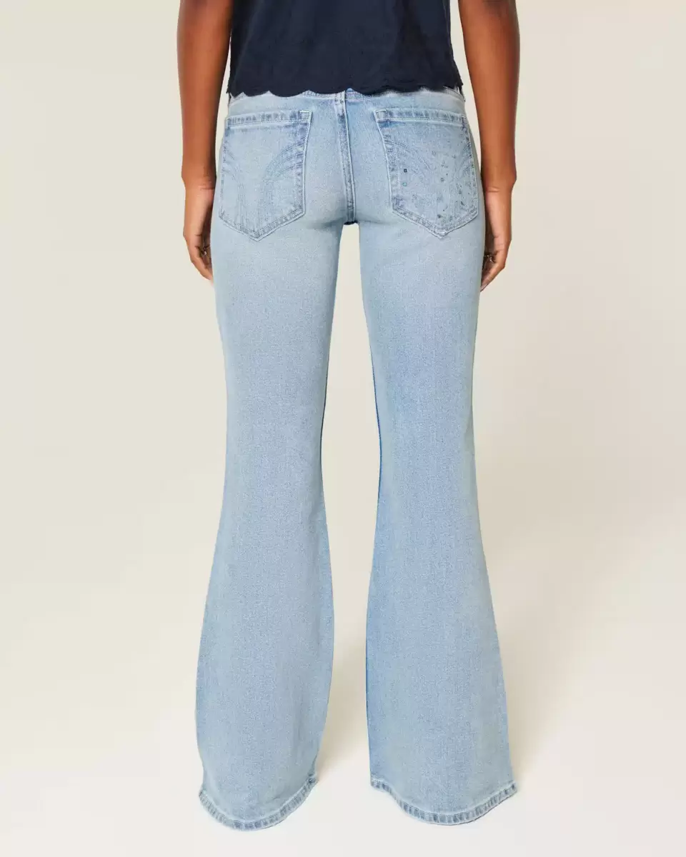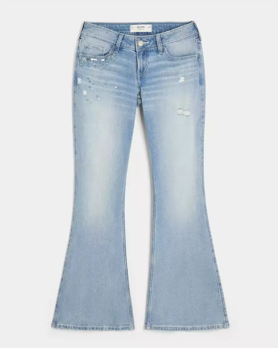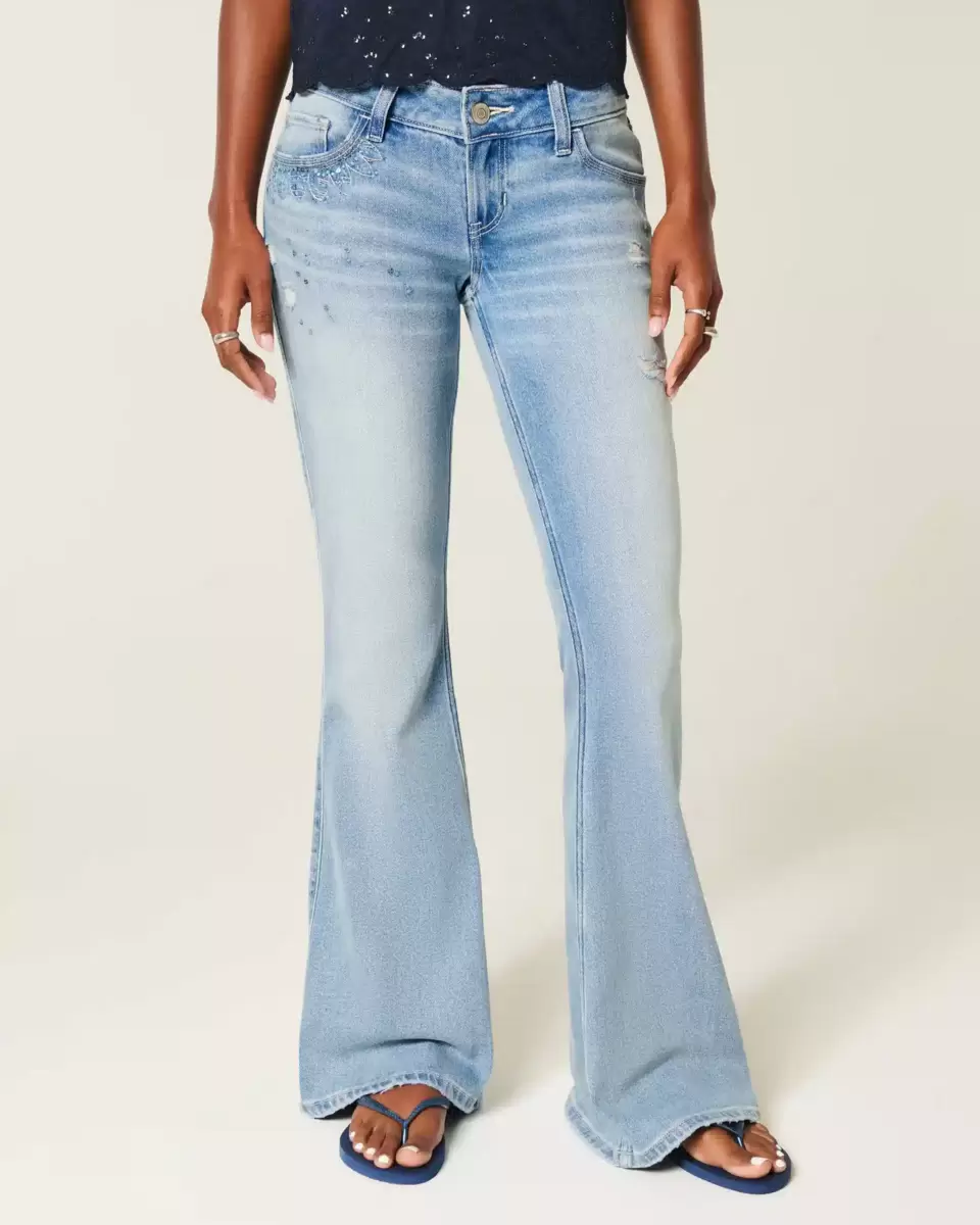 Comfortable jeans in Vintage Stretch denim, designed with an ultra low-rise waist and flared hem. Light wash with fading and whiskering, distressed details, embroidery and sequins. Imported.