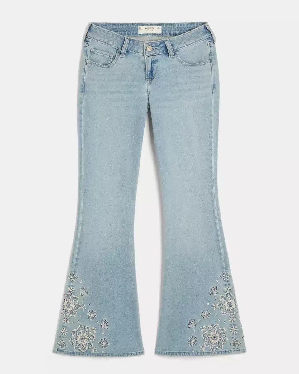 Comfortable jeans in Vintage Stretch denim, designed with an ultra low-rise waist and flared hem. Light wash with fading and whiskering, eyelet-embroidered floral details at hems. Imported.