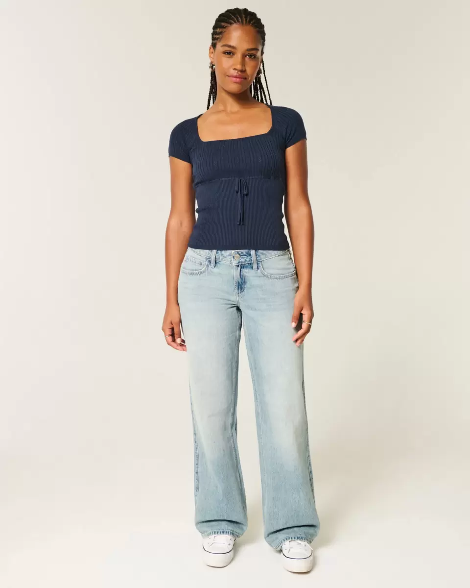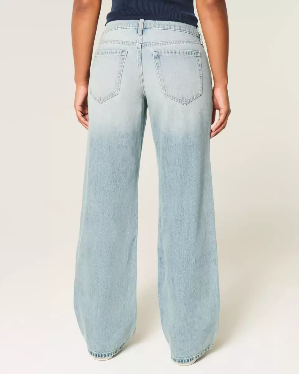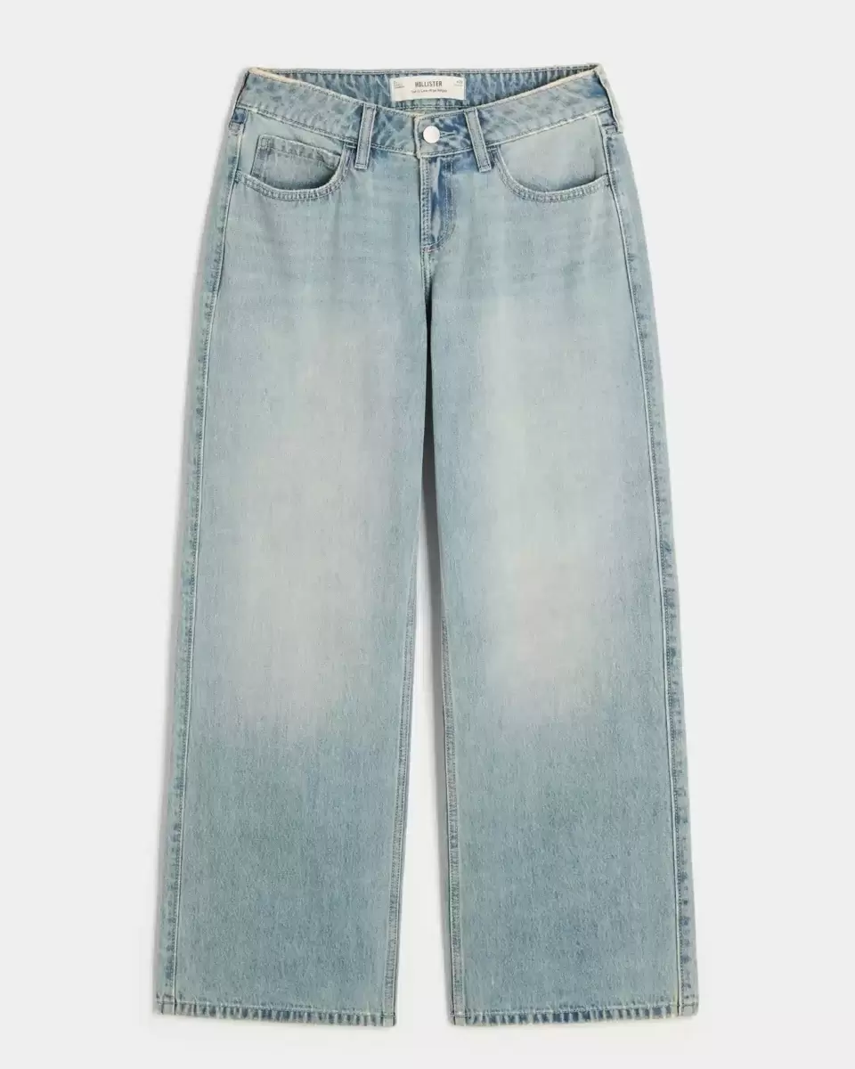 Comfortable denim jeans in a light wash, designed with a flattering low-rise waist and baggy leg. Fading, whiskering. Imported.