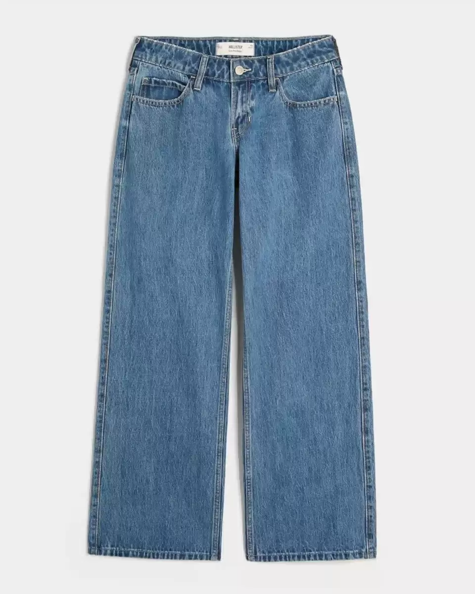 Comfortable denim jeans in a medium wash, designed with a baggy leg and flattering low-rise waist. Imported.