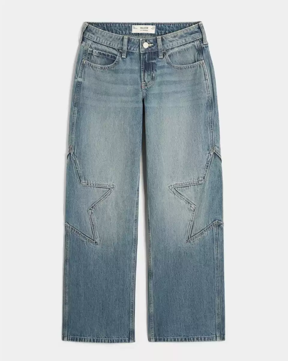 Comfortable denim jeans in a medium wash, designed with a baggy leg and flattering low-rise waist. Stitched star graphics at sides, fading, whiskering. Imported.