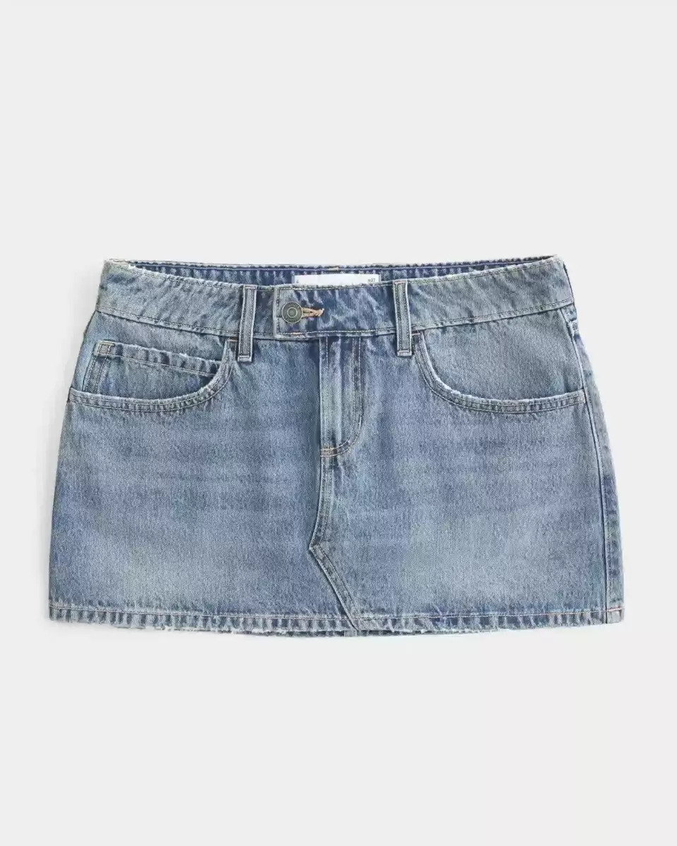 A cute denim mini skort designed with a low-rise waist and hidden knit shorts. Medium wash with fading and whiskering. Imported.