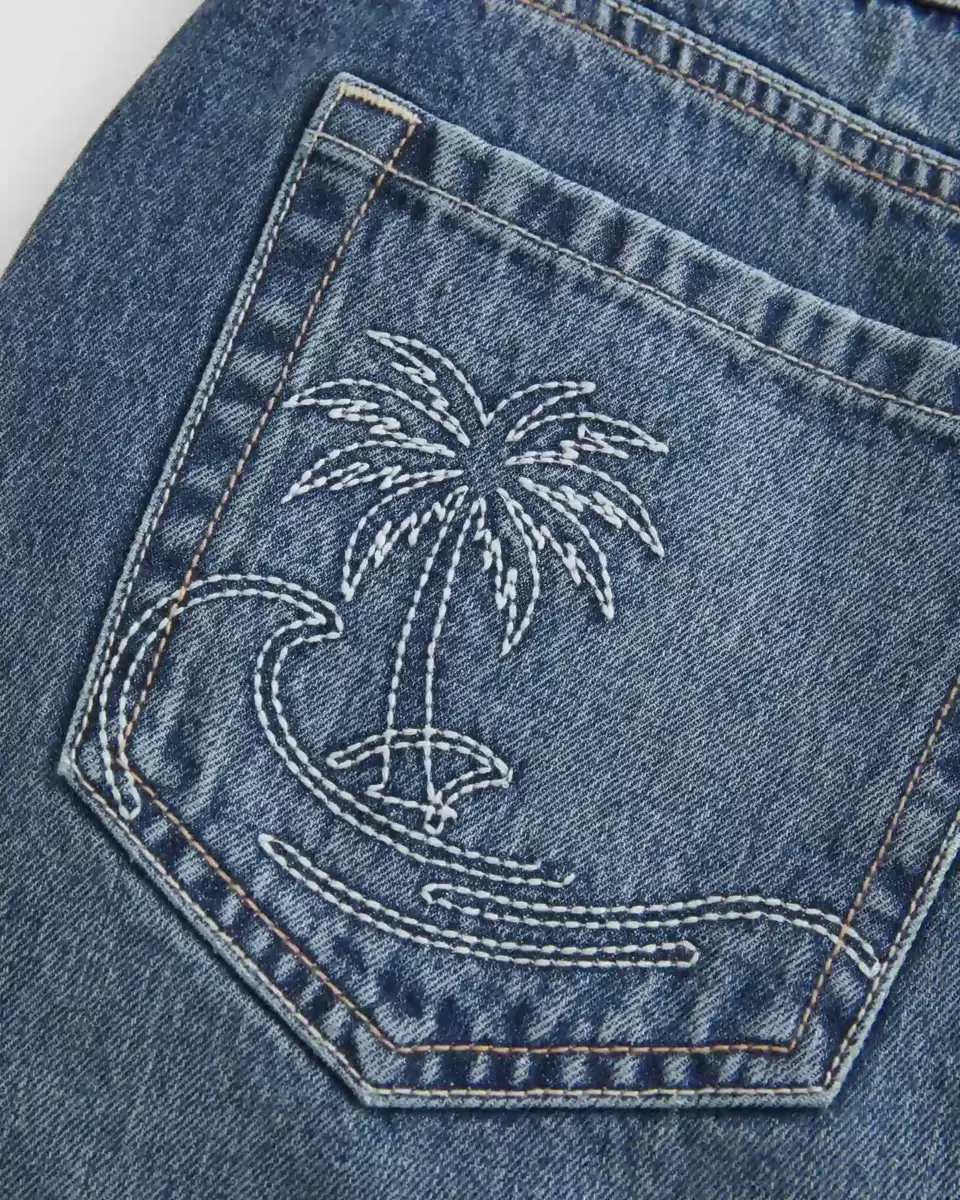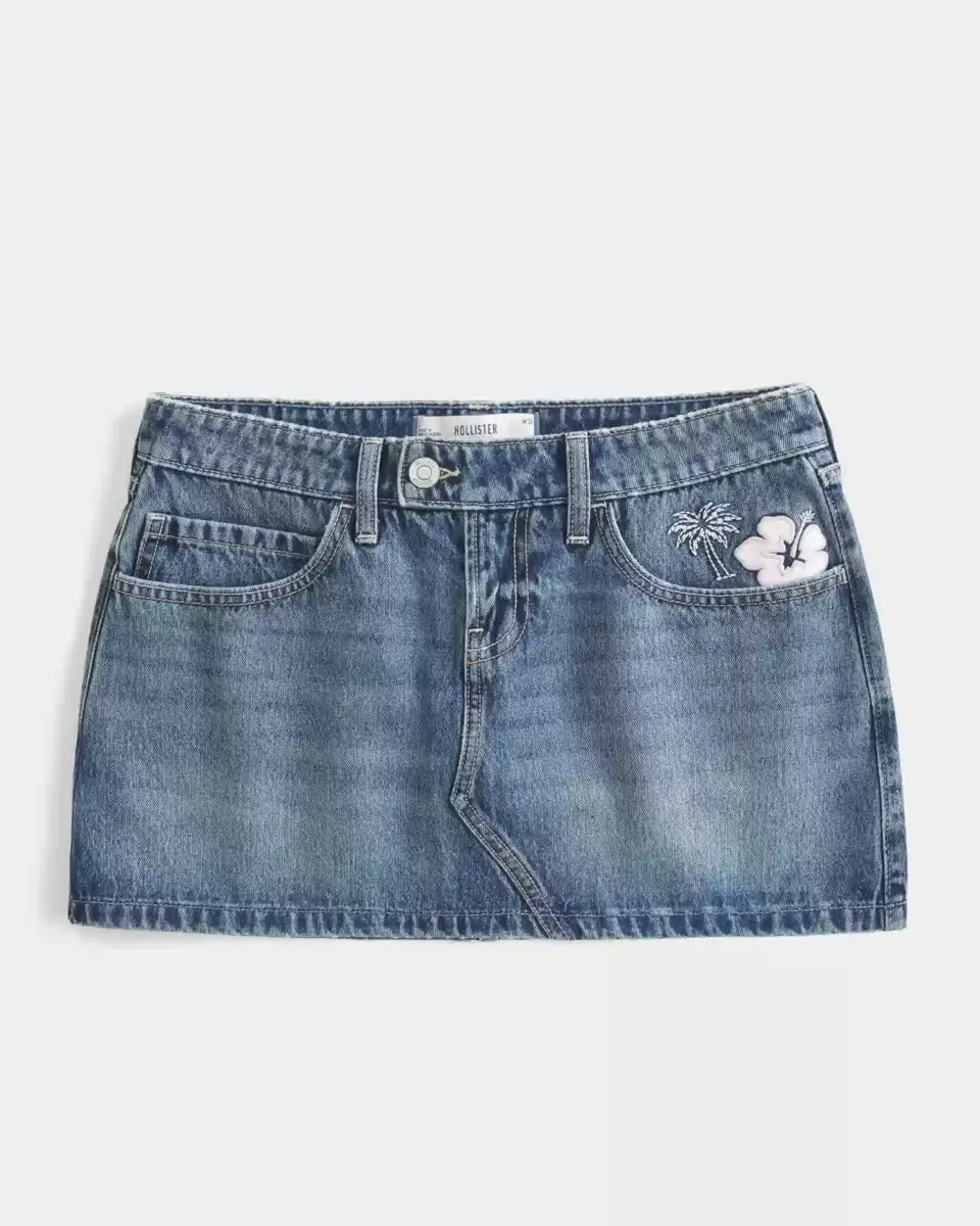 A cute denim mini skort designed with a low-rise waist and hidden knit shorts. Medium wash with fading and whiskering, beach and surf embroidery on the front pocket and back right