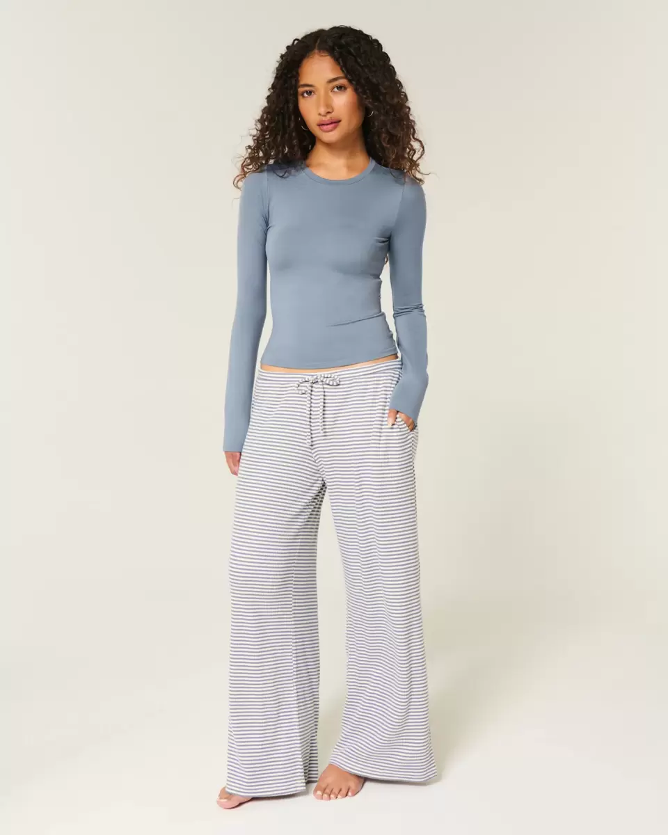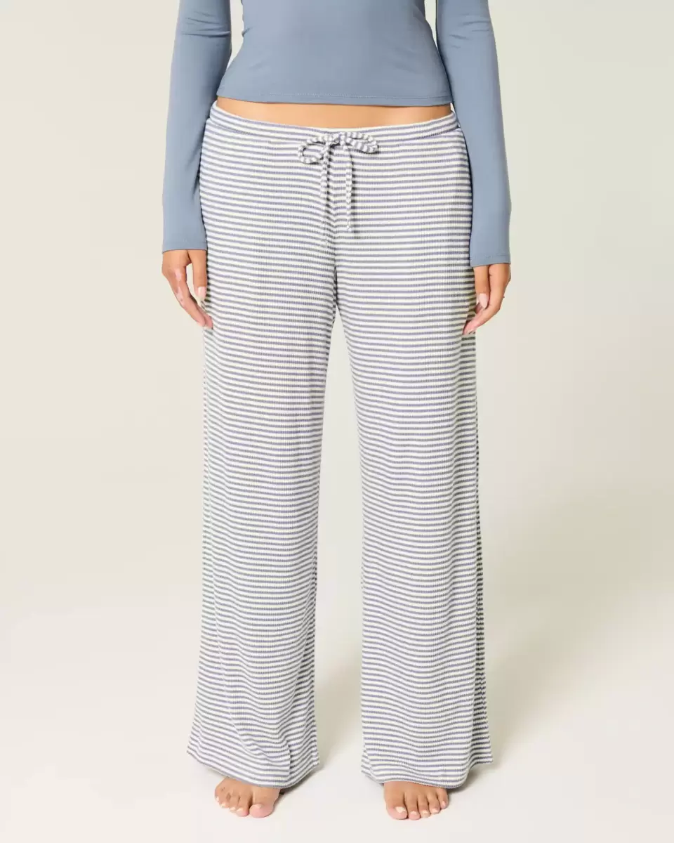 Super cute and comfortable wide-leg pants made with cozy ribbed fabric. Drawstring waist, pockets. Imported.
