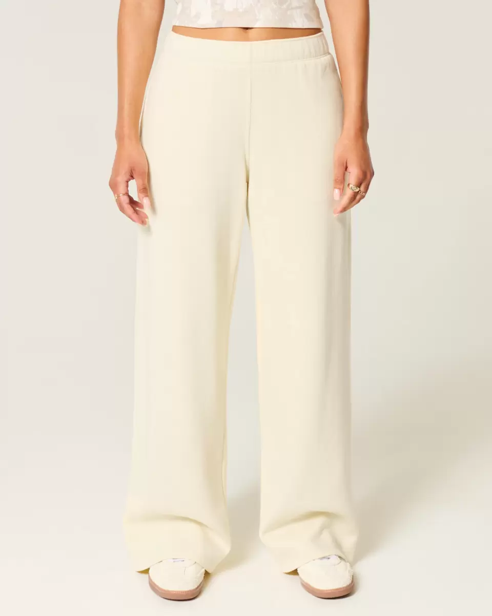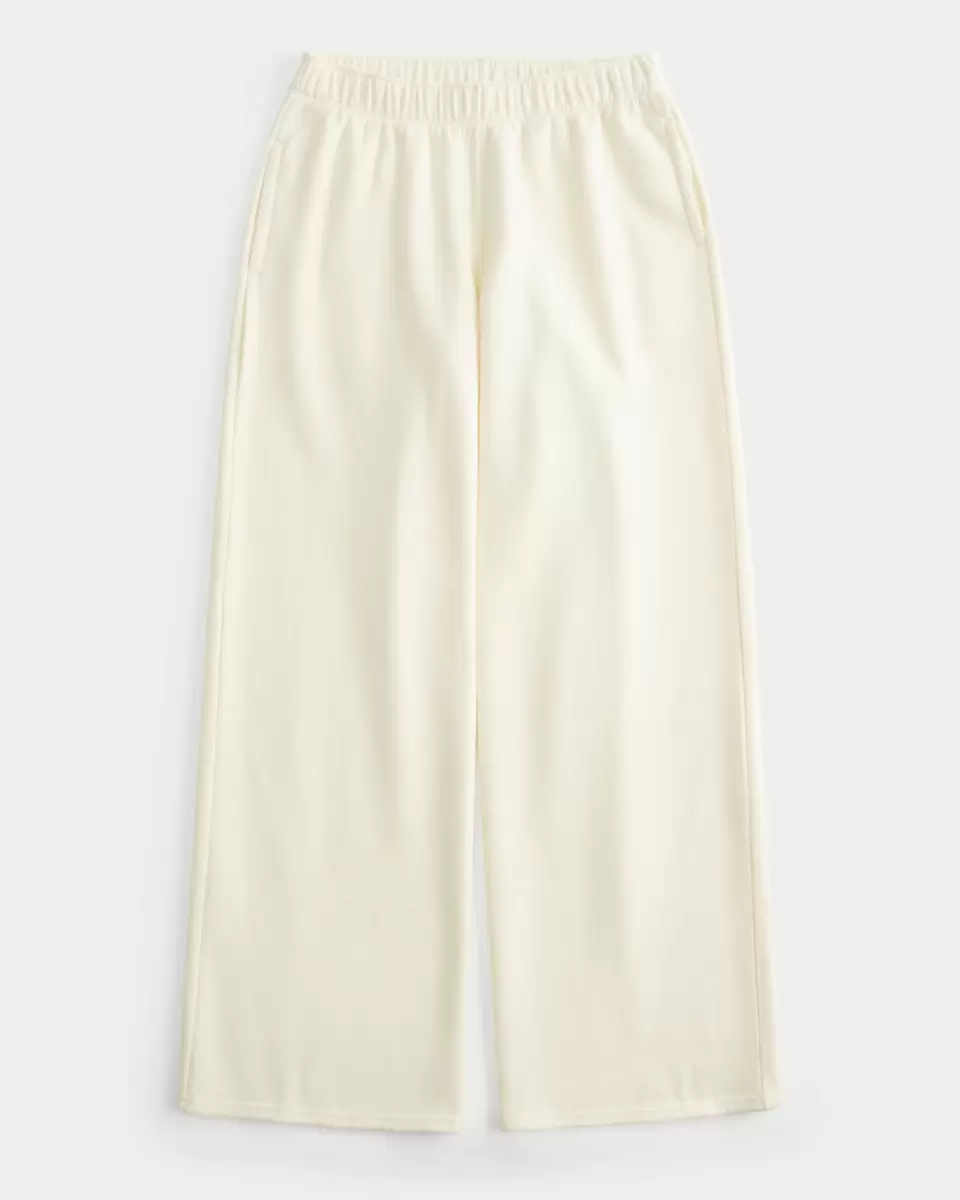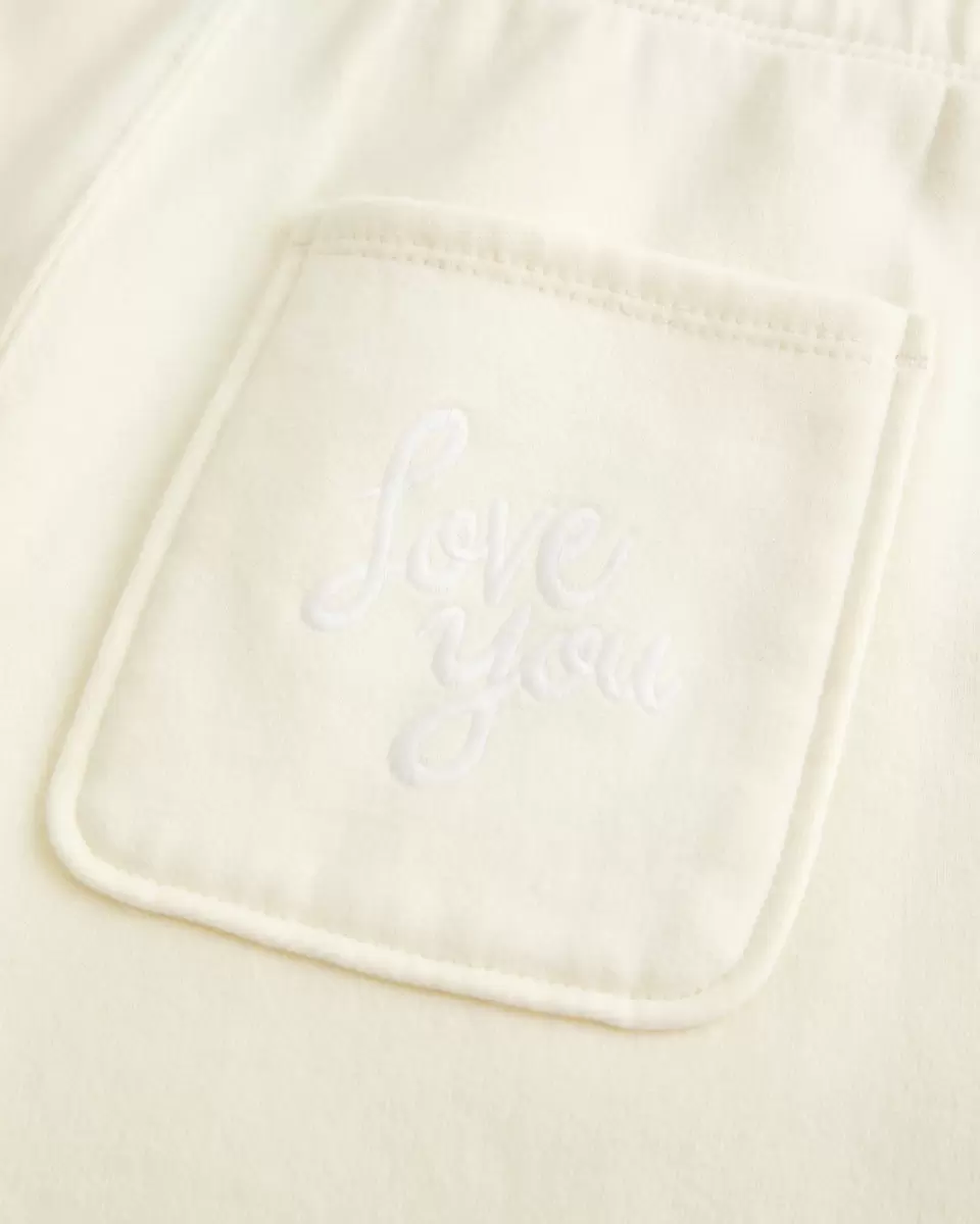 Super soft fleece sweatpants designed with a wide leg and banded waist. Love You graphic embroidery at back pocket. Imported.