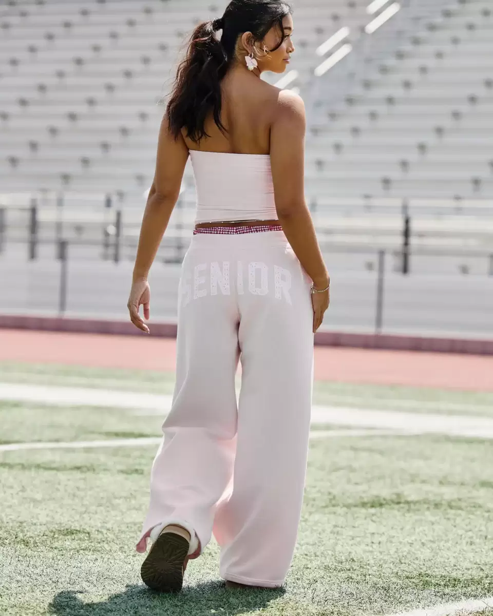 Super soft fleece sweatpants designed with a baggy leg and banded waist. Front pockets, Senior graphic applique with eyelet embroidery at back. Imported.
