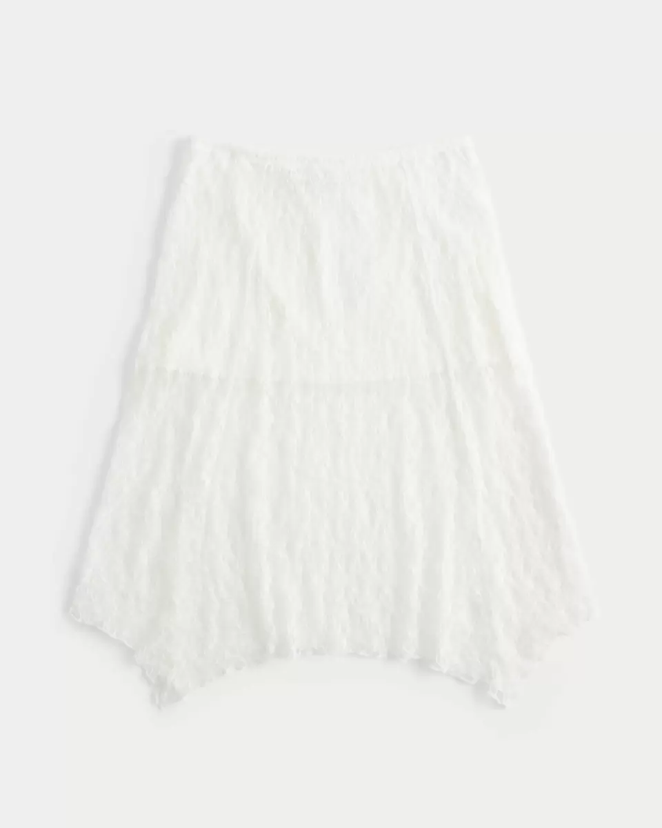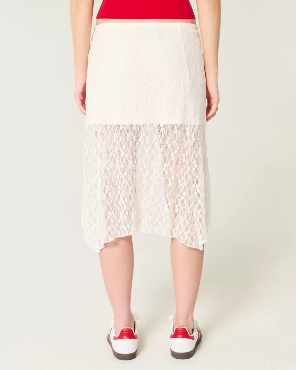 Flowy and super soft, this skirt is designed with a midi length and low-rise waist. Features pretty all-over lace fabric and an asymmetrical hem. Side seam zipper, mini-length lining. Imported.