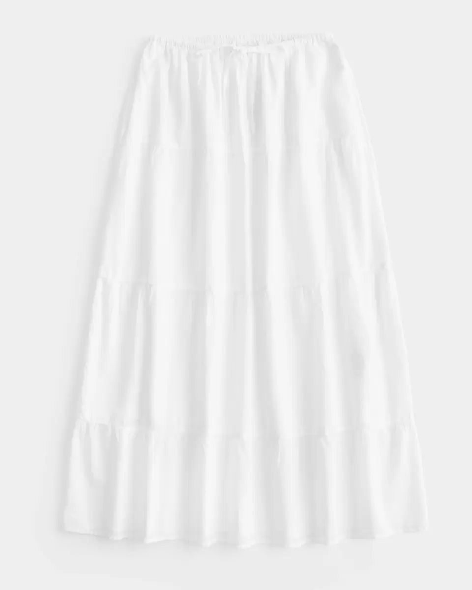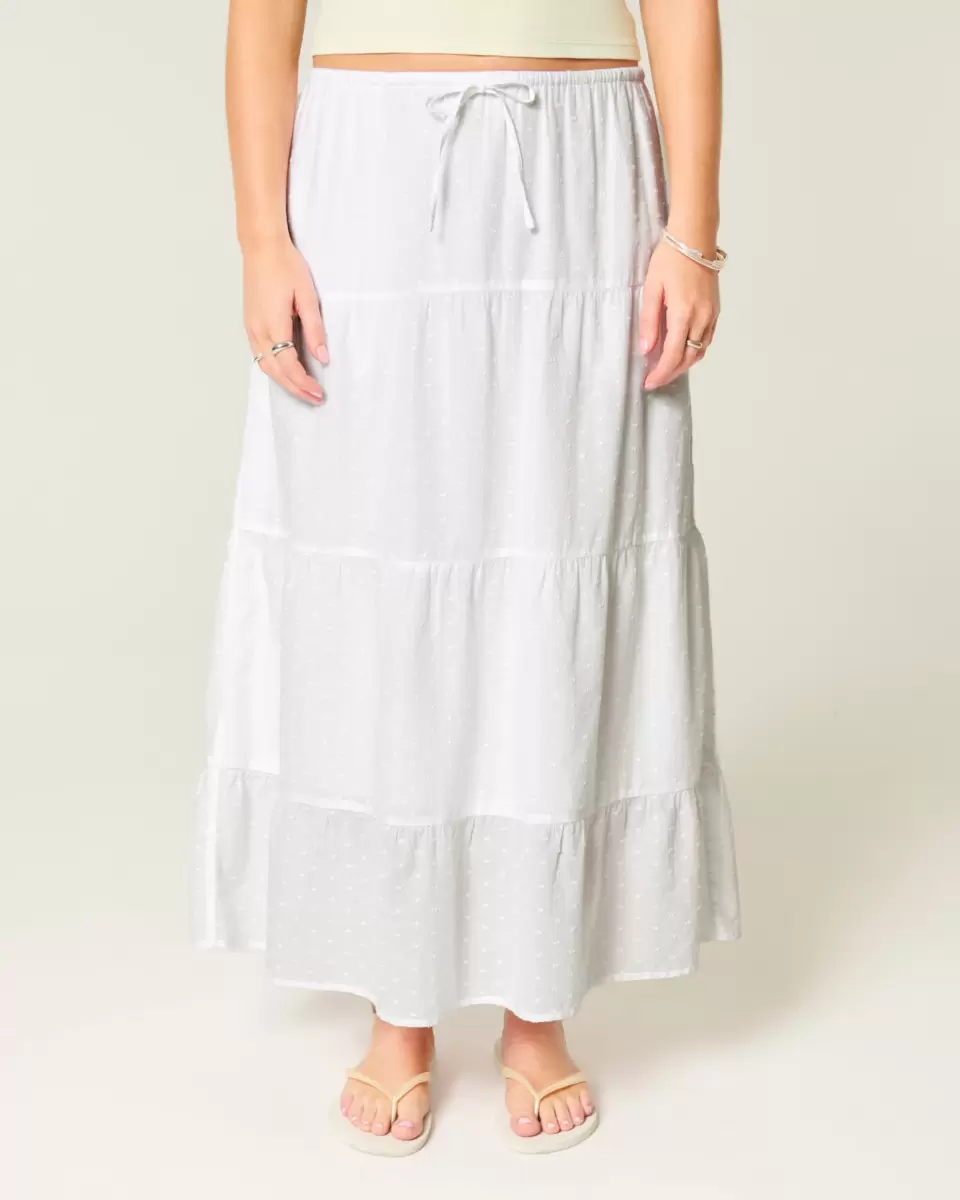 Flowy and super soft, this maxi-length skirt has an adjustable-rise waist and textured clip dot fabric. Tiered details.
