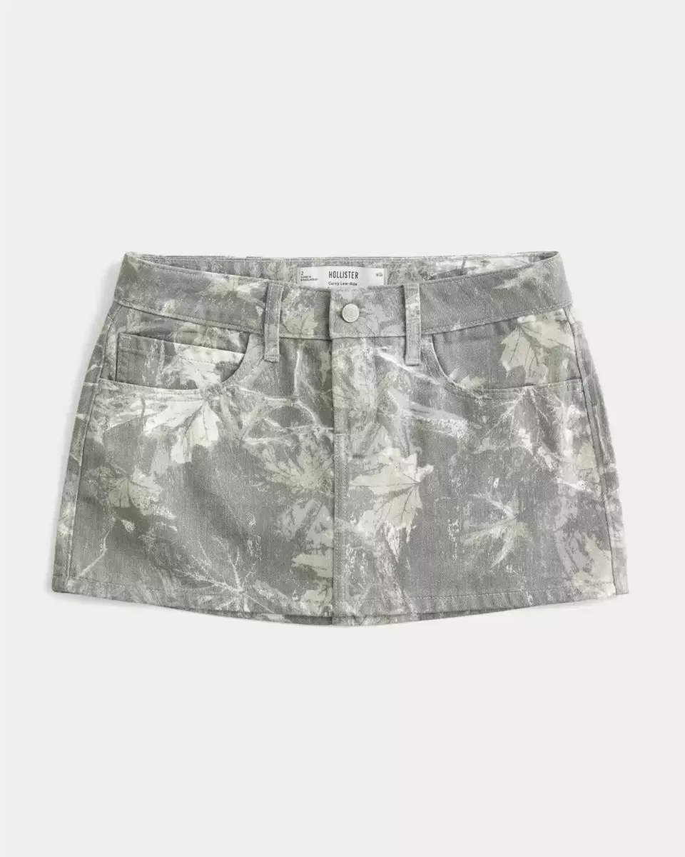 A cute denim mini skort designed with a flattering curvy low-rise waist. Hidden knit shorts, camo pattern. Imported.