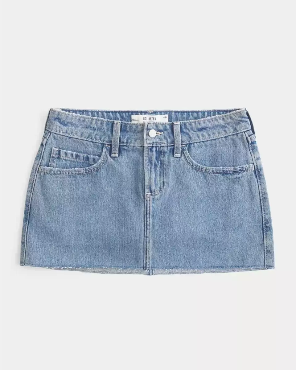 A cute denim mini skort designed with a flattering curvy low-rise waist. Hidden knit shorts, raw edged hem. Imported.