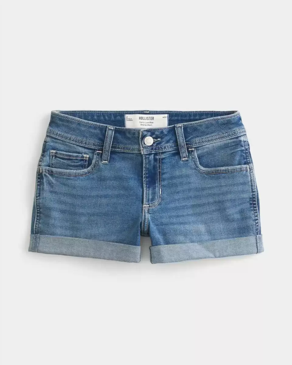 Cute and comfy denim shorts in a medium wash, designed with a curvy low-rise waist and shortie short fit. Fading, whiskering, rolled hems.