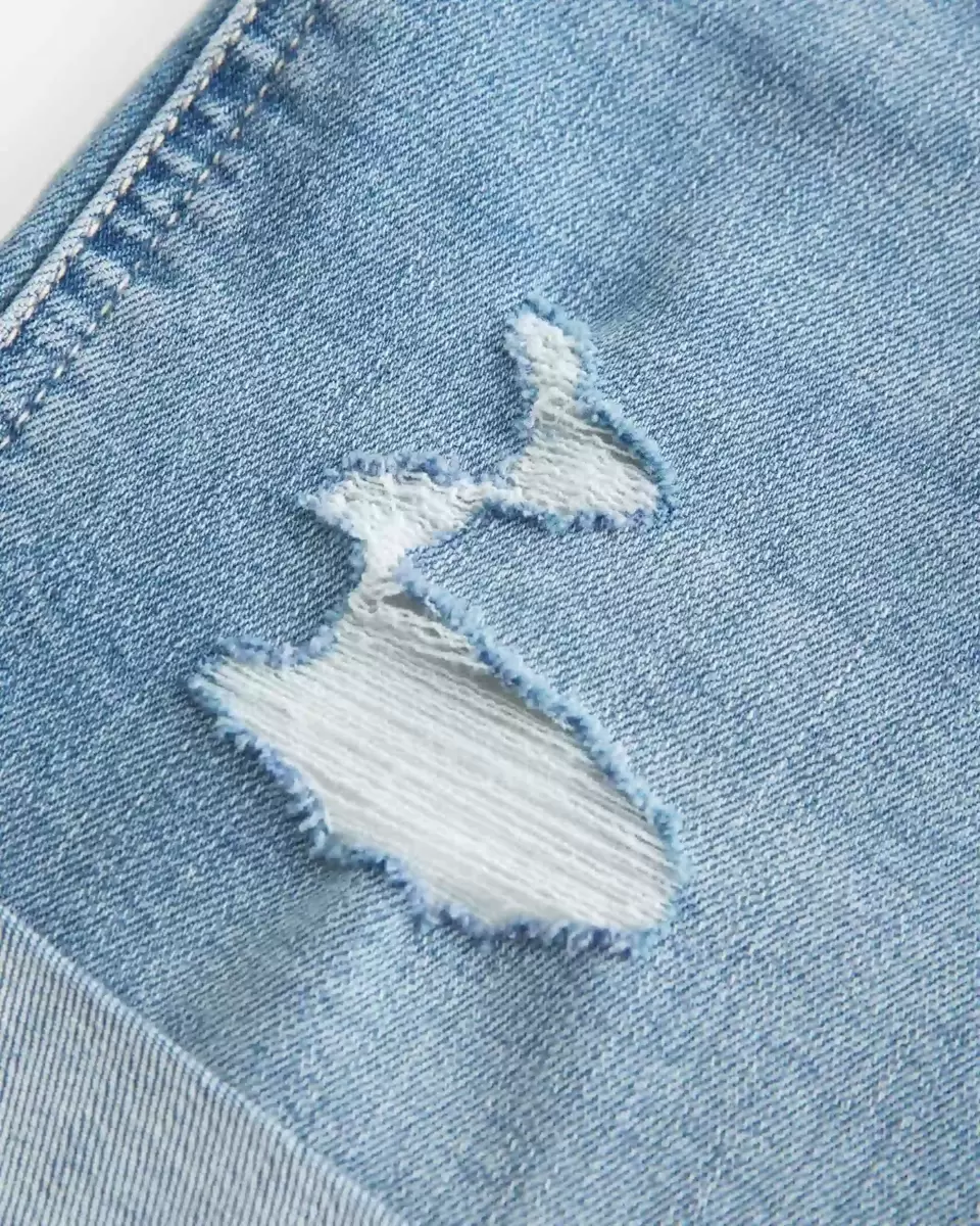 Cute denim shortie shorts designed with a flattering high-rise waist. Medium light wash with fading, whiskering and ripped details. Cuffed hems, super comfortable Soft Stretch denim. Imported.