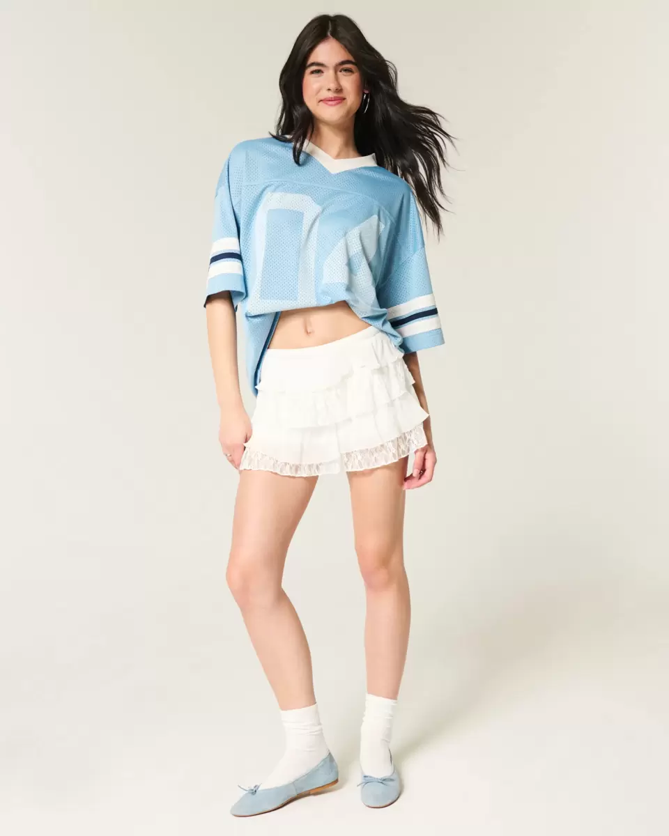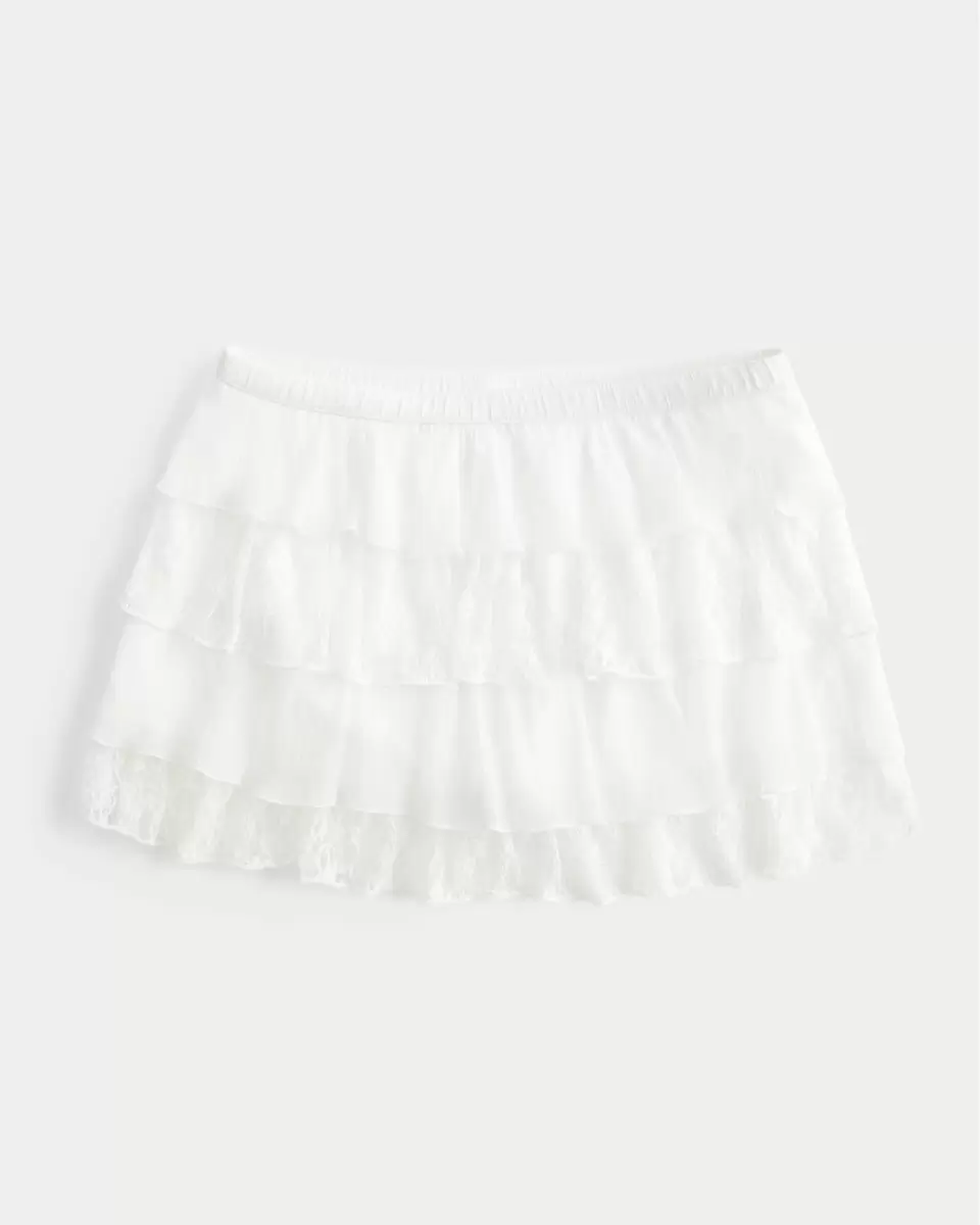 A cute and comfy mini skort with built-in shorts and a pull-on waistband. Tiered detailing with chiffon and lace fabric. Imported.