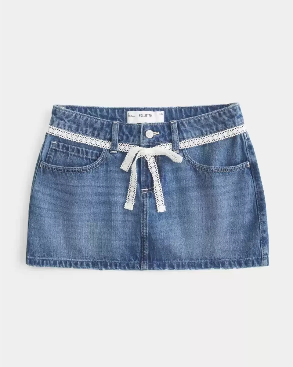 A cute denim mini skort designed with a low-rise waist and hidden knit shorts. Removable and adjustable lace waist tie detail.