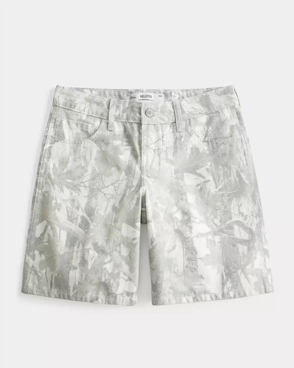 Comfortable denim shorts designed with a low-rise waist and baggy fit. All-over camo pattern. Imported.