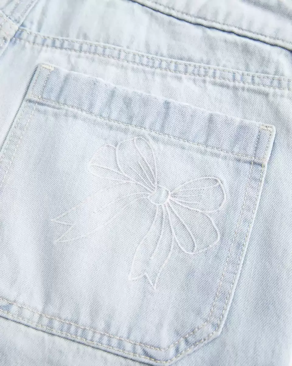 Cute denim shorts in a light wash, designed with a low-rise waist and baggy leg. Fading, whiskering, embroidered bow graphic at right coin pocket. Imported.