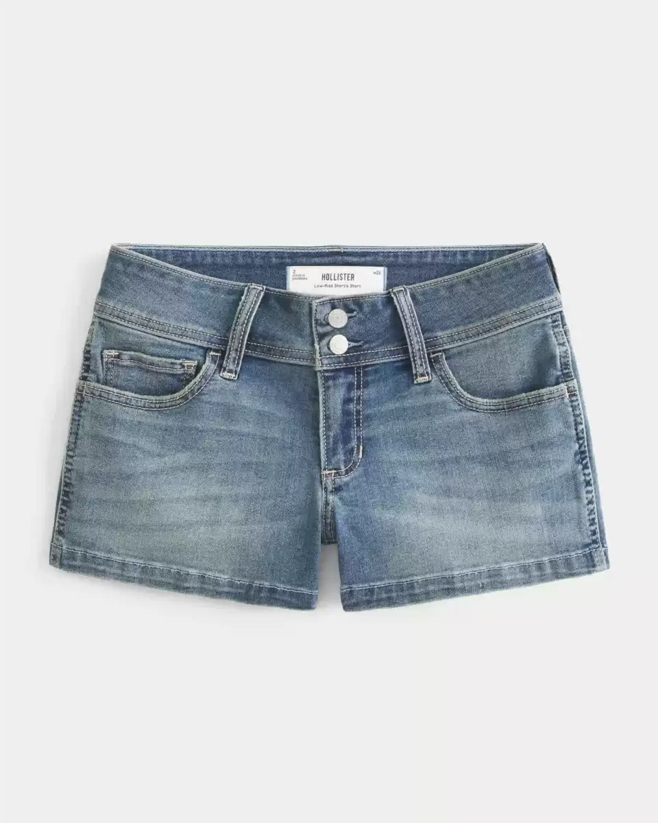 Cute and comfy denim shortie shorts in a tinted light wash with fading and whiskering. Low-rise waist. Imported.