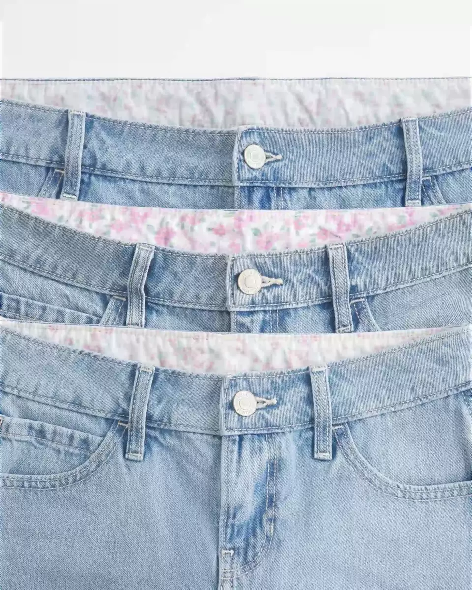 Cute and comfy denim shorts designed with a low-rise waist and baggy leg. Medium wash, floral interior waist pattern, 5″ inseam.