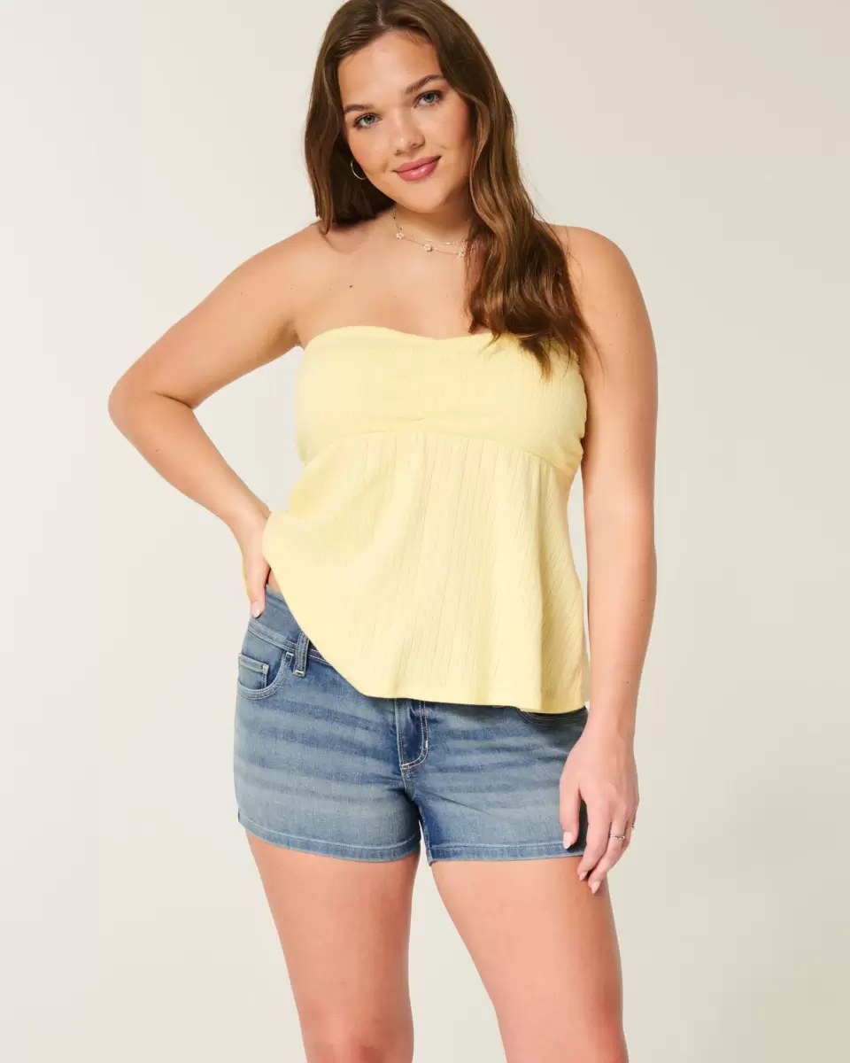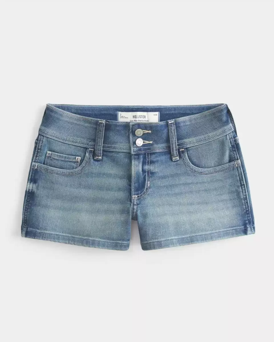 Cute and comfy denim shortie shorts in a medium wash. Embroidered logo detail in back pocket stitching, fading, whiskering, low-rise waist. Imported.