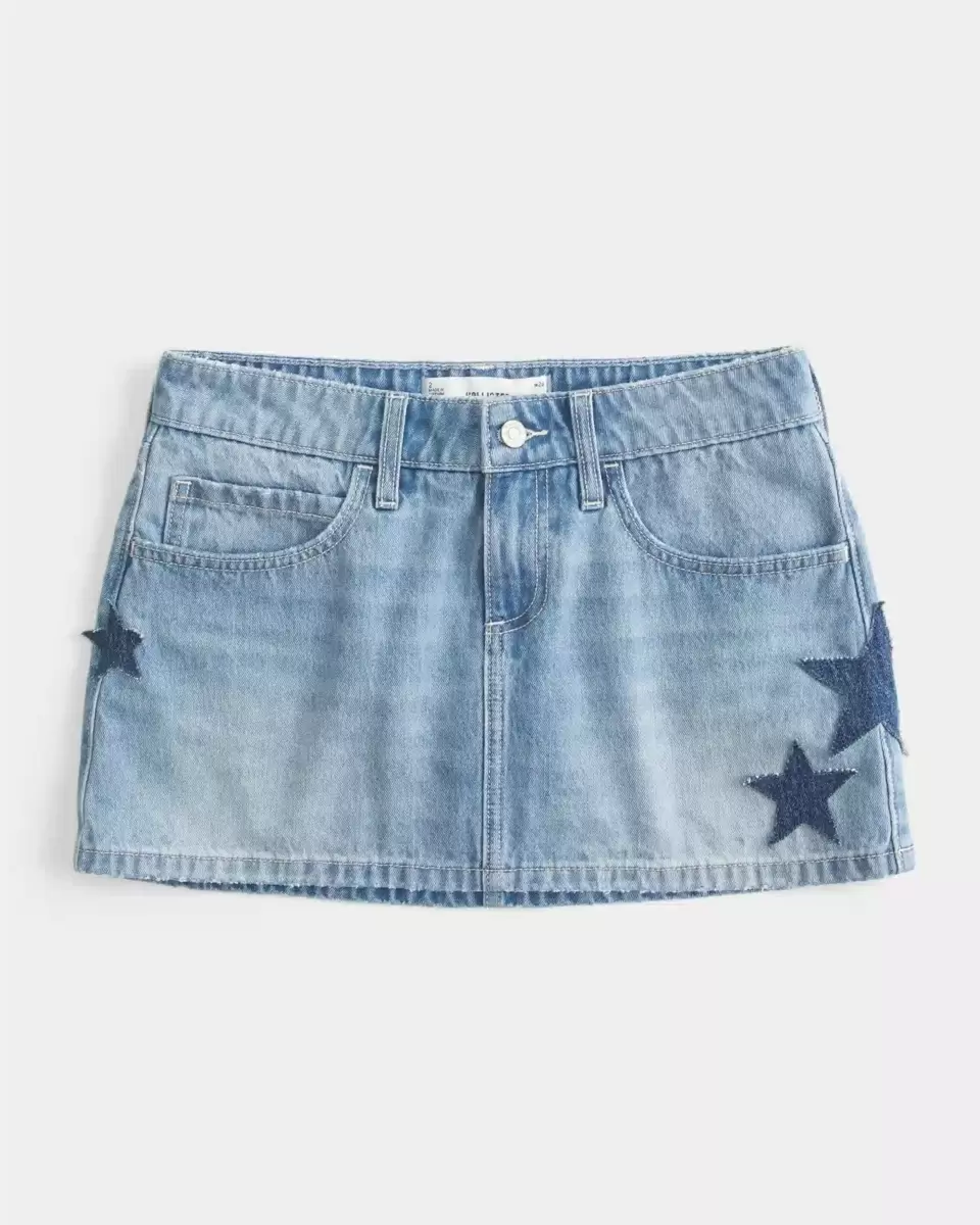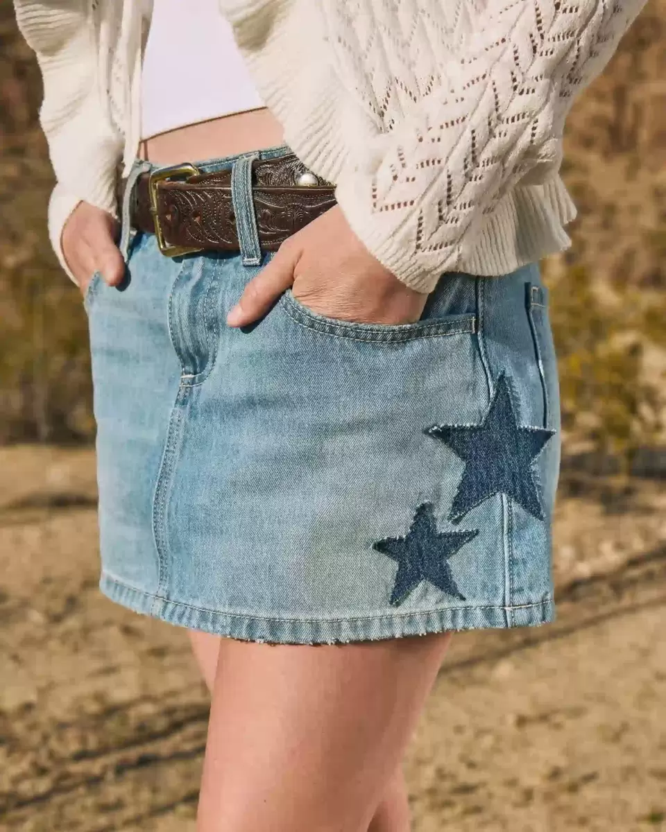 A cute denim mini skort in a medium wash, designed with a low-rise waist and built-in shorts with a phone pocket. Fading, whiskering, star applique. Imported.