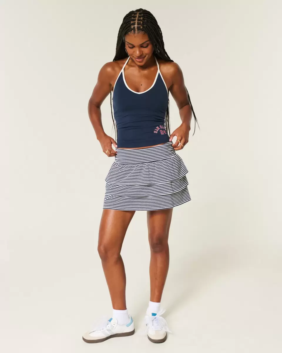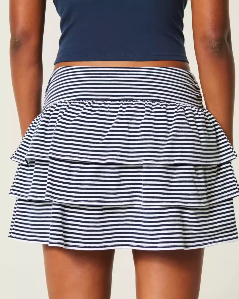 This cute mini skort is designed with a mid-rise waist and features hidden knit shorts with a side phone pocket. Soft and stretchy knit fabric, pretty ruffled tiers. Imported.