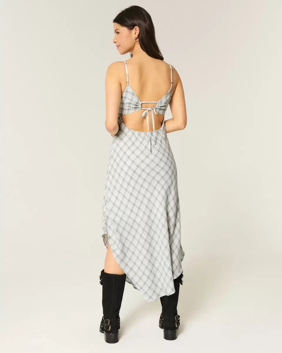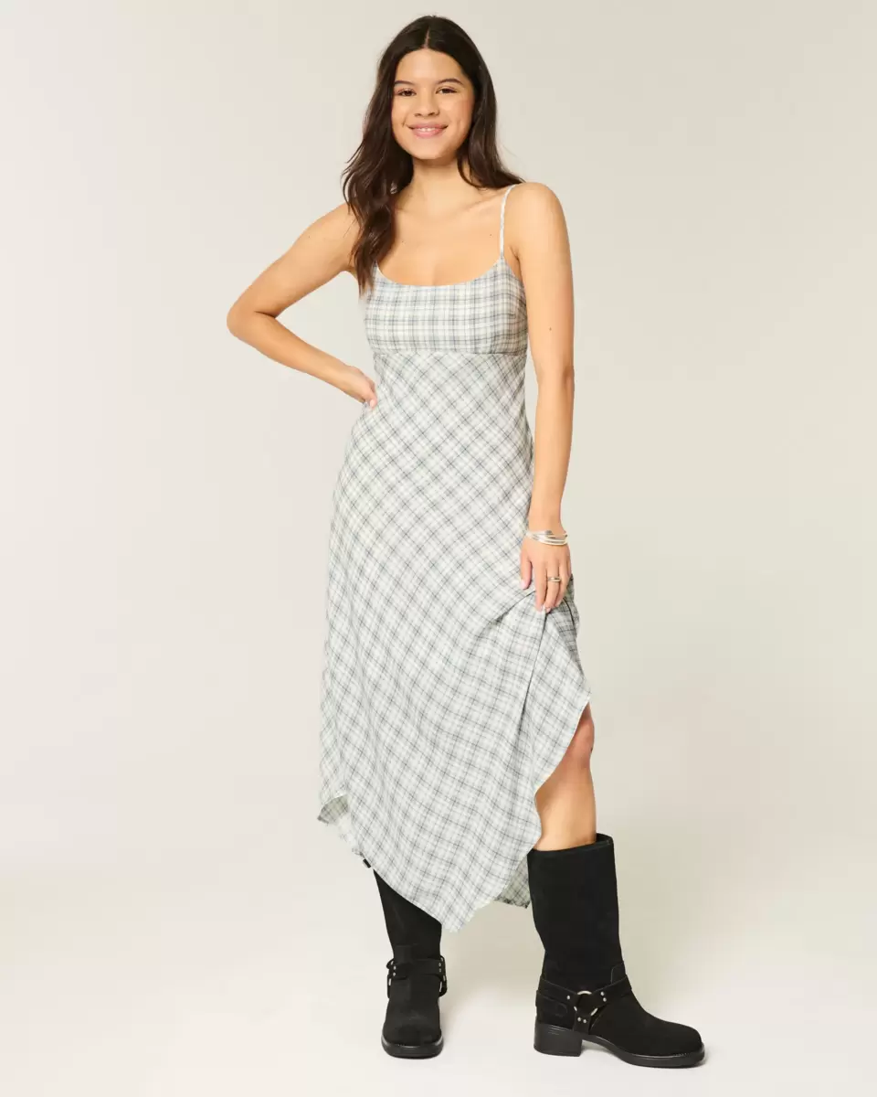 Flowy and super soft, this midi-length dress features an asymmetrical hem and adjustable straps. Imported.