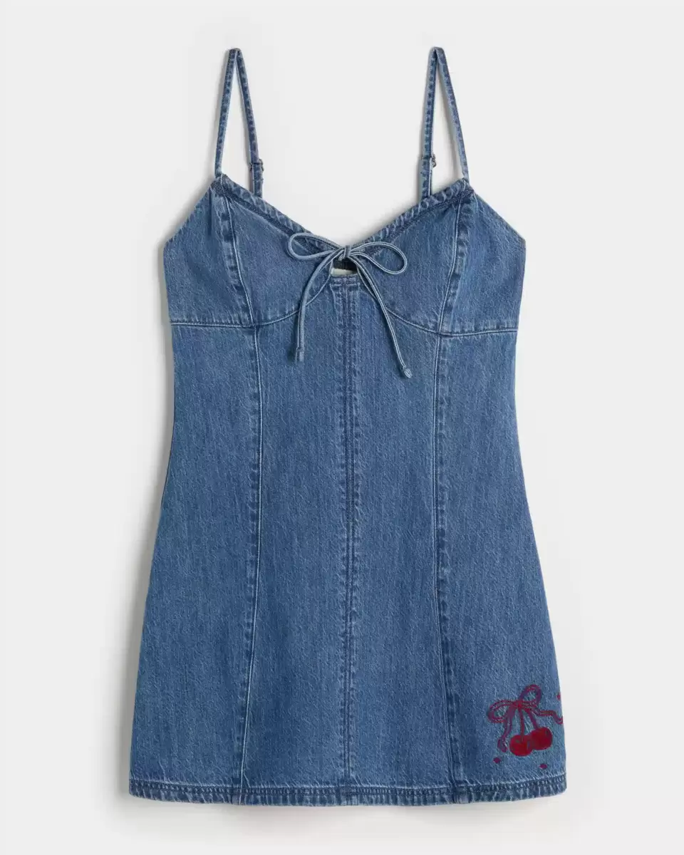This cute denim mini dress features classic seam details and a tie at the center neckline. Adjustable straps, cherry graphic embroidery.