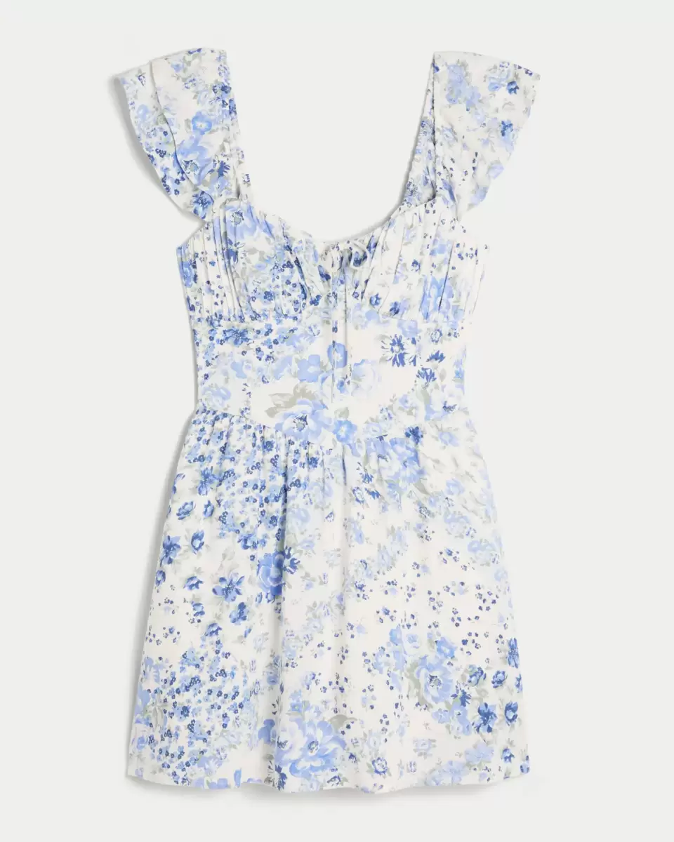 Pretty and super soft, this dress features ruched detailing through the bust, a front tie detail and tiered flutter sleeves. Bra-covering back detail, flowy skirt, hidden shorts, p