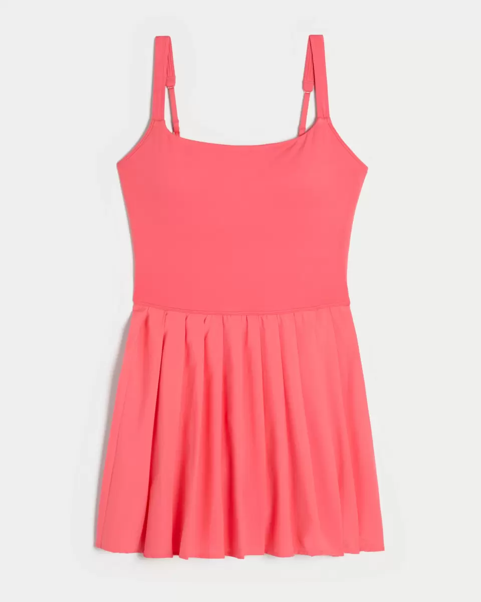 This cute and comfy active dress features a built-in shelf bra with removable pads and built-in bathroom-friendly shorts. Adjustable straps, pretty pleated skirt. Imported.