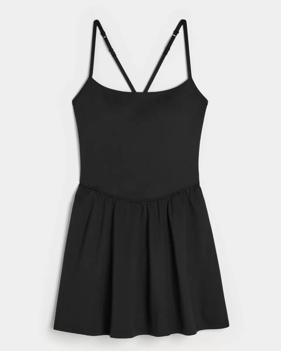 This super cute dress is made with soft active fabric and features a built-in shelf bra with removable pads and hidden bathroom-friendly shorts. Strappy back. Adjustable straps. Imported.