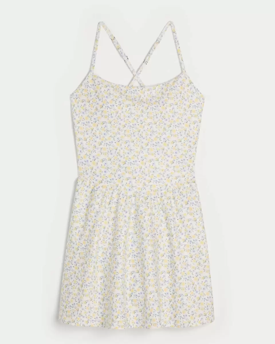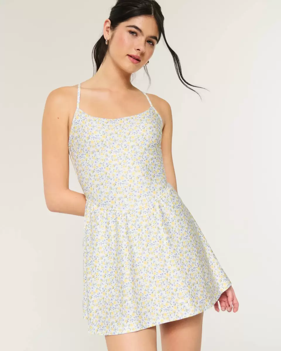 This super cute dress is made with soft active fabric and features a built-in shelf bra with removable pads and hidden bathroom-friendly shorts. Strappy back. Adjustable straps.