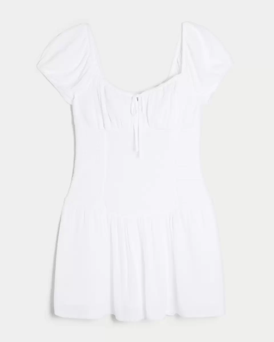 A flowy and super soft mini-length dress with short sleeves and a drop waist detail with side smocking. Flutter sleeves, pockets, built-in woven shorts, center tie detail at neckline. Imported.