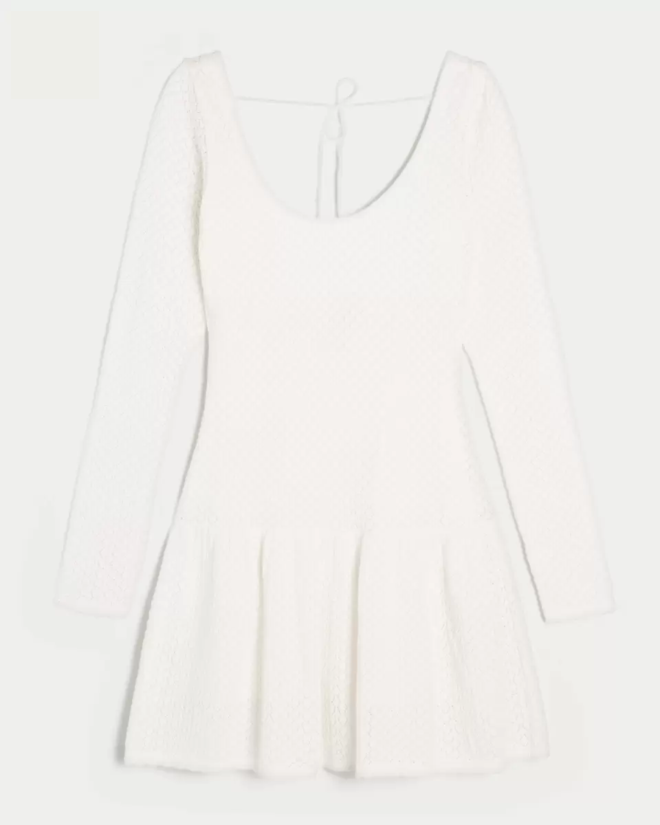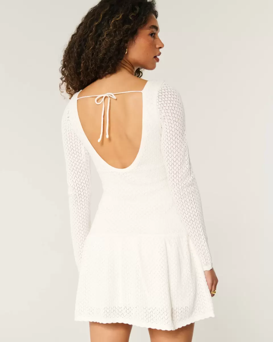 A cute and super soft long-sleeve dress featuring all-over crochet-style stitched patterns, a skater skirt and open back. Built-in shelf bra, scoop neckline. Imported.
