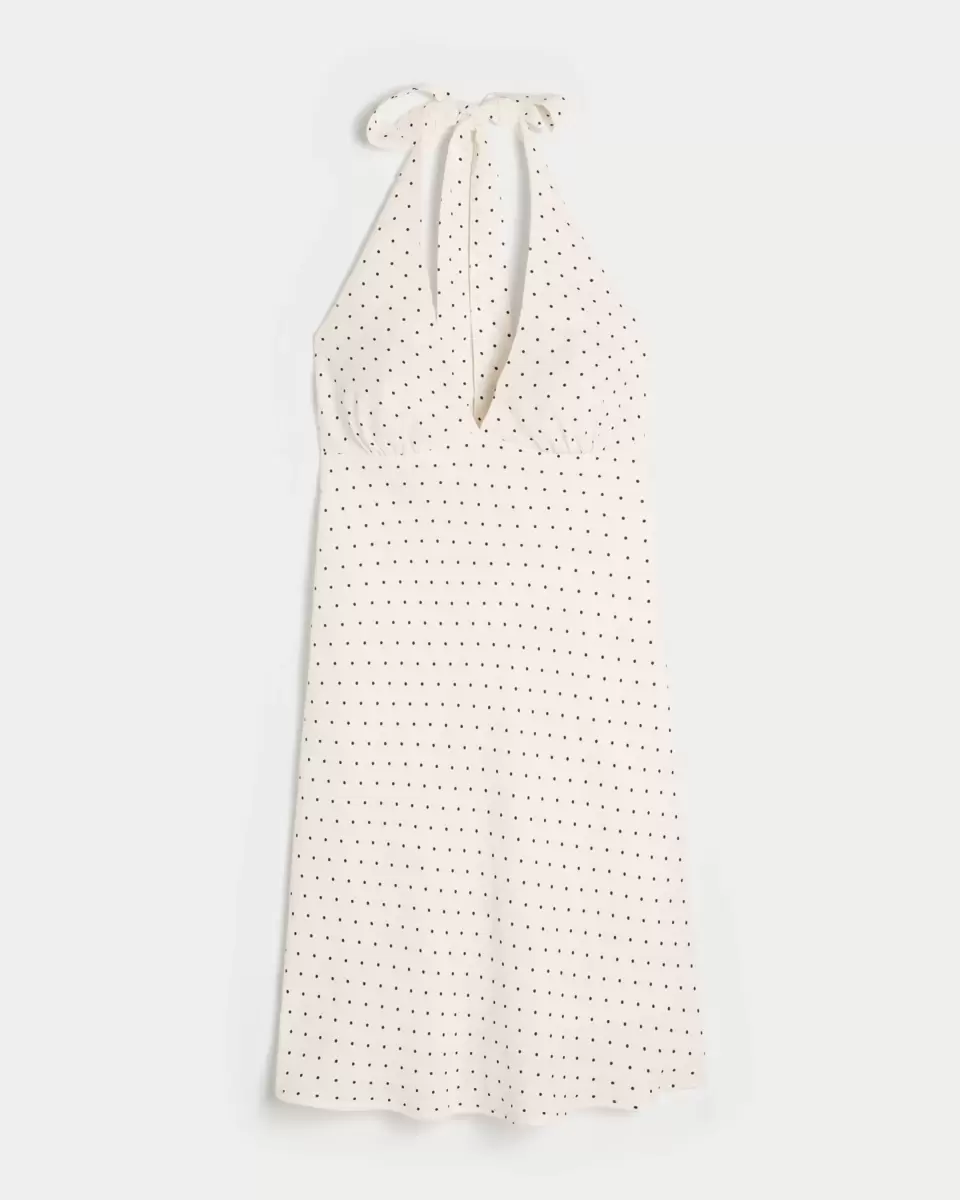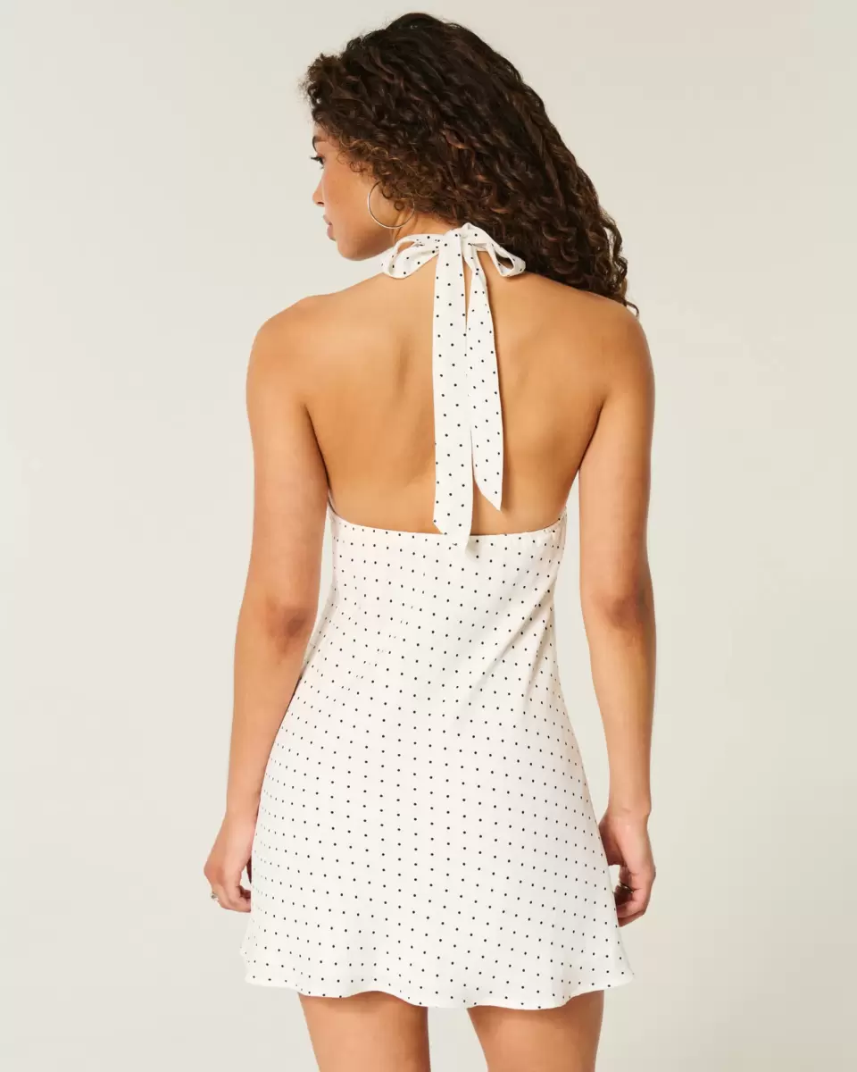 Flowy and super soft, this dress features halter straps, an open back detail and removable pads. Mini length, pretty crepe fabric.