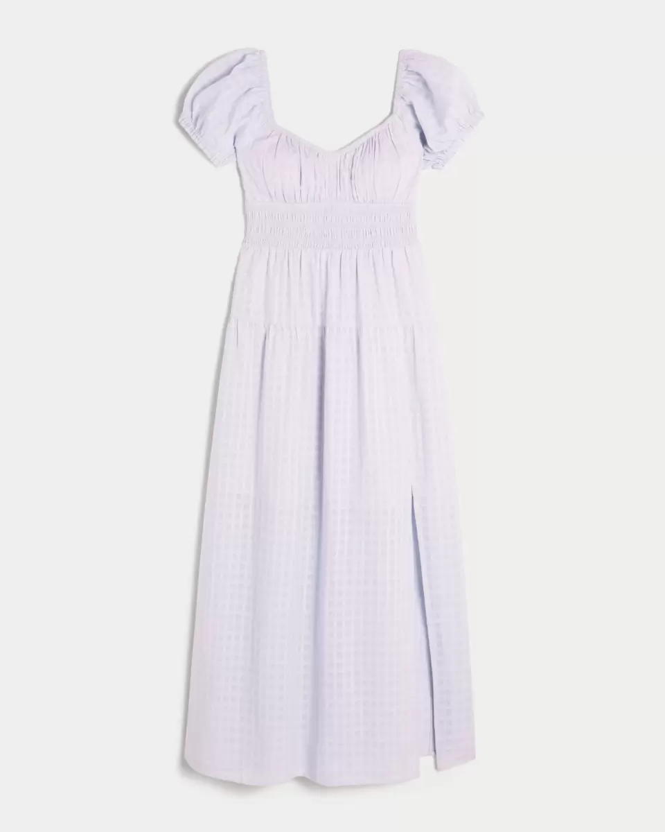 A pretty and super soft maxi-length dress with an open back detail and removable pads. Short sleeves, pockets, soft smocked waist, split hem detail.