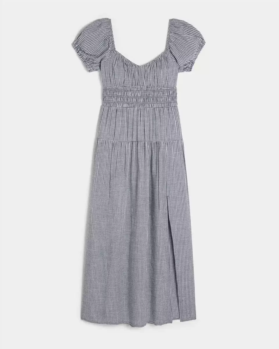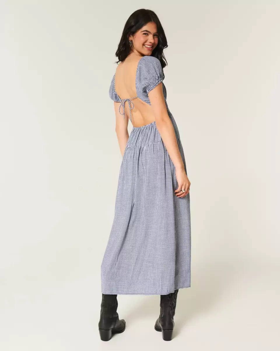 A pretty and super soft maxi-length dress with an open back detail and removable pads. Short sleeves, pockets, soft smocked waist, split hem detail. Imported.