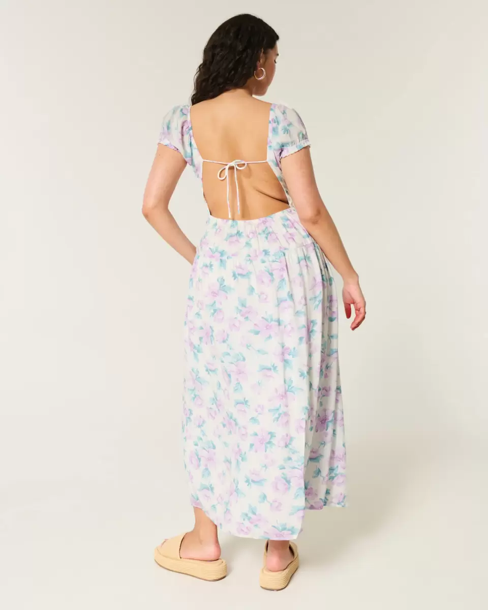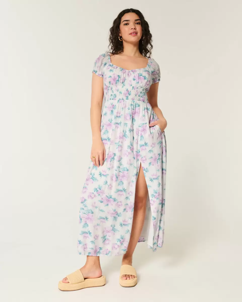 A pretty and super soft maxi-length dress with an open back detail and removable pads. Short sleeves, pockets, soft smocked waist, split hem detail. Imported.
