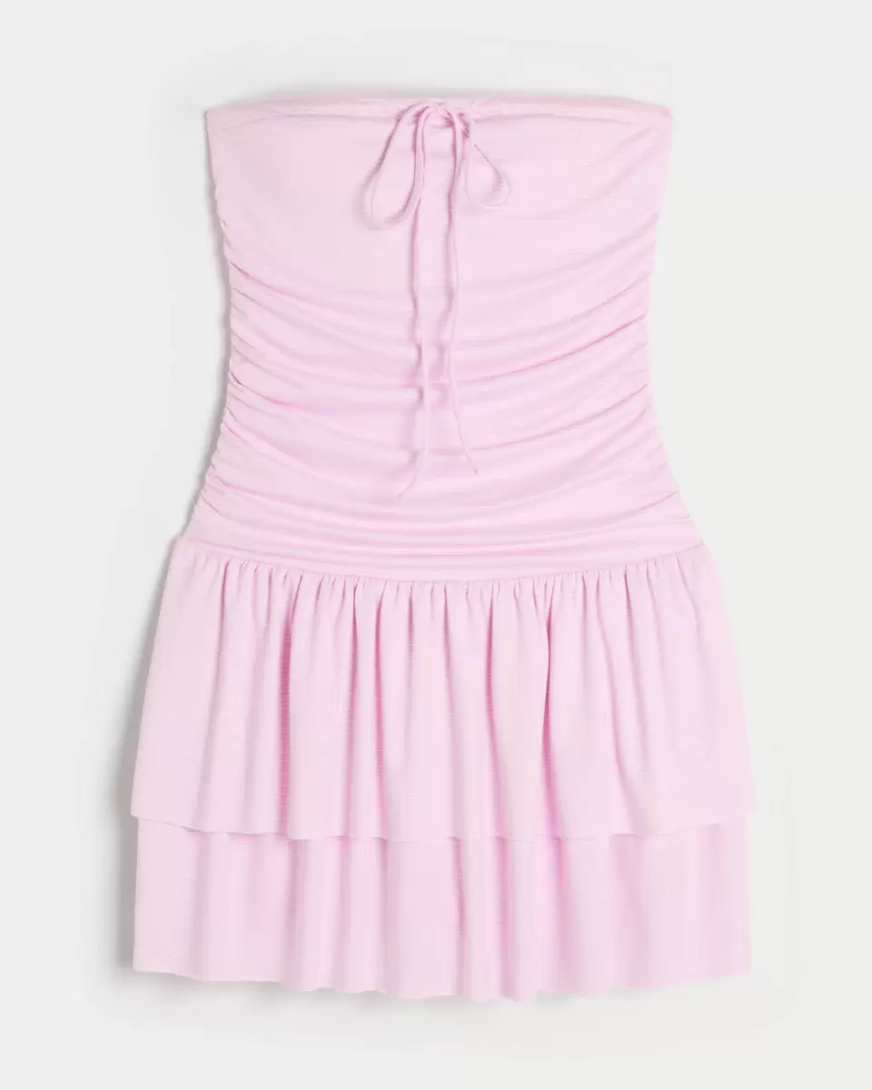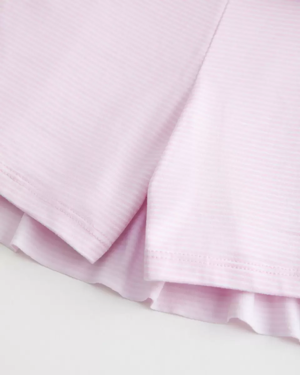A cute and super soft skort dress in knit fabric with a tiered skirt and tie neckline. Slim through the bodice, built-in shorts. Imported.