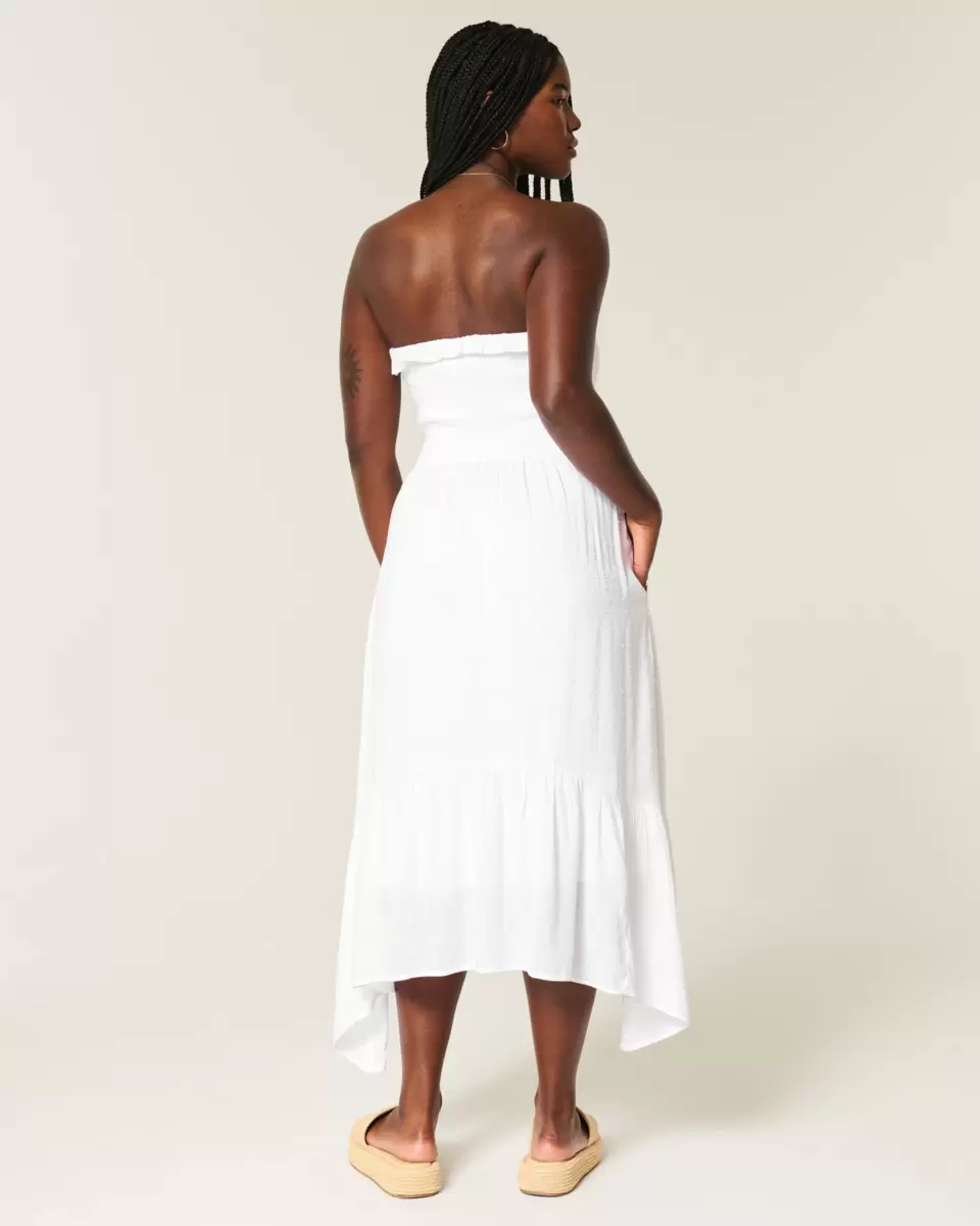 Flowy and super soft, this maxi-length dress features an asymmetrical hem and soft smocked bodice. Pretty ruffled neckline with center tie detail.