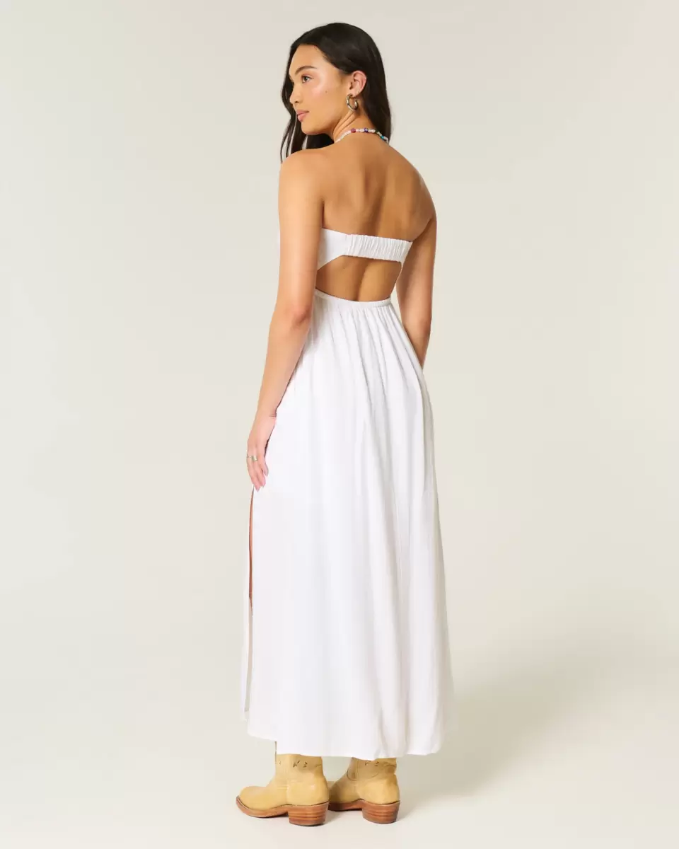 Flowy and super soft, this maxi-length dress features a pretty twist bust detail. Strapless, split hem detail.