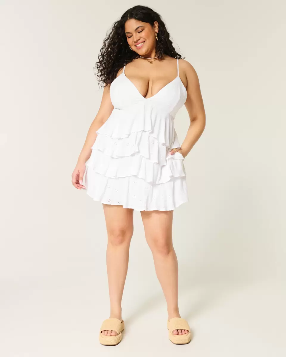 This soft and flowy mini dress is designed with a cute babydoll silhouette and features a back detail, removable pads and pockets. V-neckline, ruffled tiers, adjustable straps, textured eyelet-embroidered pattern. Imported.