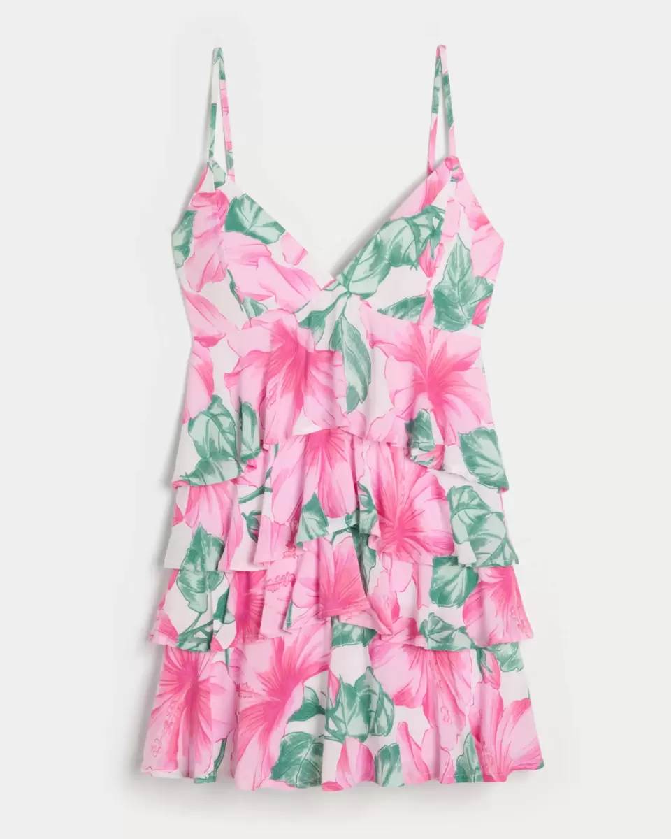 Flowy and super soft, this mini dress features pretty ruffled tiers and a v-neckline. Back detail, removable pads, pockets. Imported.