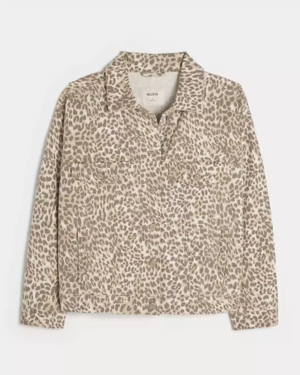 This classic denim jacket features an all-over leopard print and button-down chest pockets. Full button closure, collar. Imported.