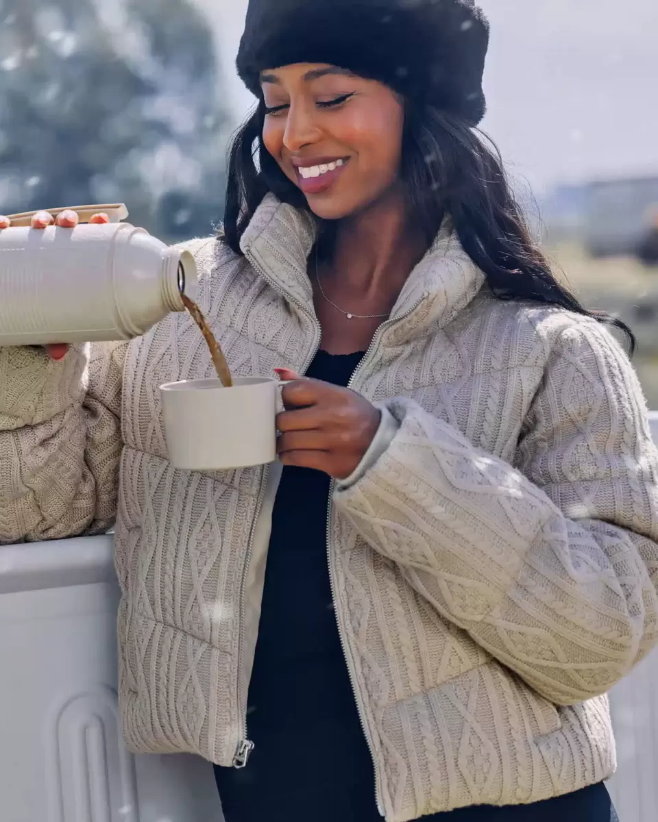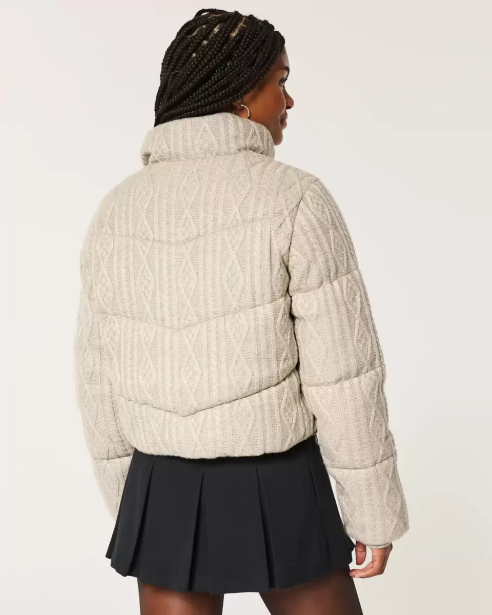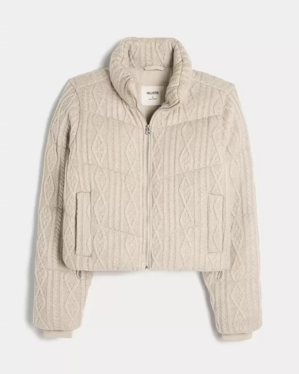 This cute and cozy mini puffer jacket is made with soft sweater-knit fabric with cable-knit patterns and quilted channels. Full zip-up closure, mock-neck collar, pockets, drawcord hem, fully lined, ribbed cuffs. Imported.
