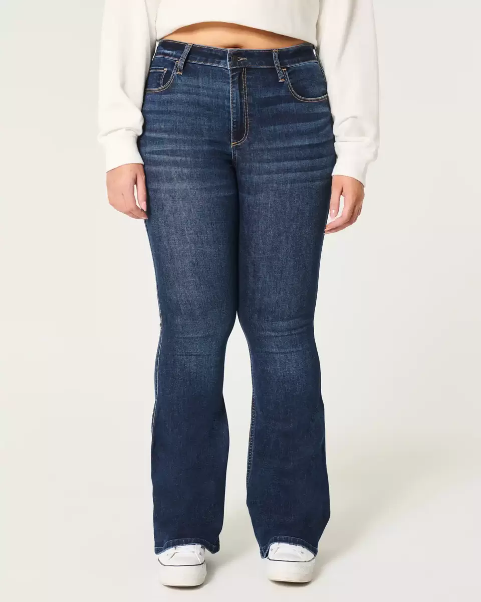 Designed with a high-rise waist, slim leg and flared hem. Dark wash denim with stretch, fading and whiskering. Imported.