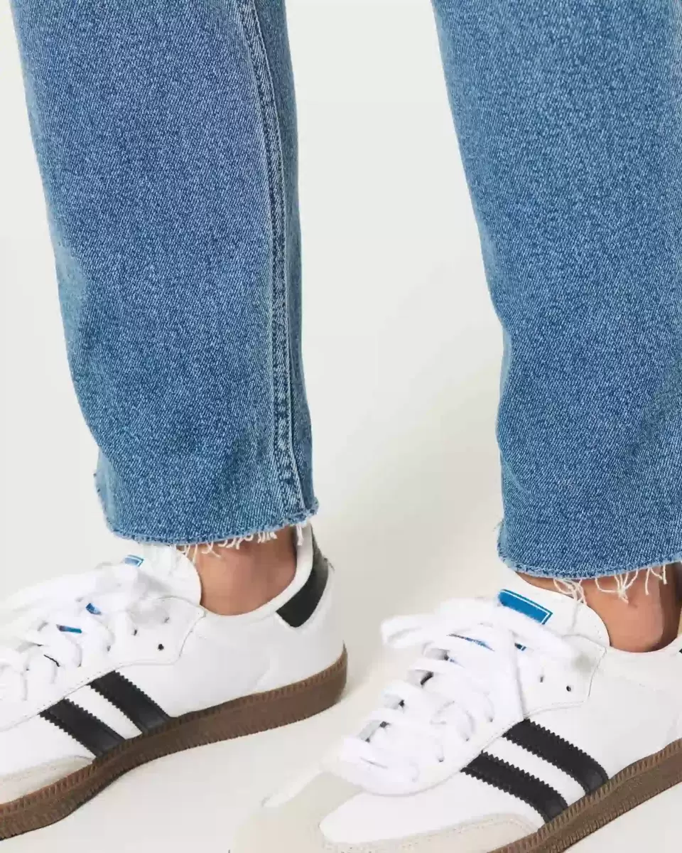 Designed with a relaxed leg and an ultra high-rise waist with fading, whiskering and ripped details. Cuffed hems, ultra-comfortable Vintage Stretch denim in a medium wash. Imported.