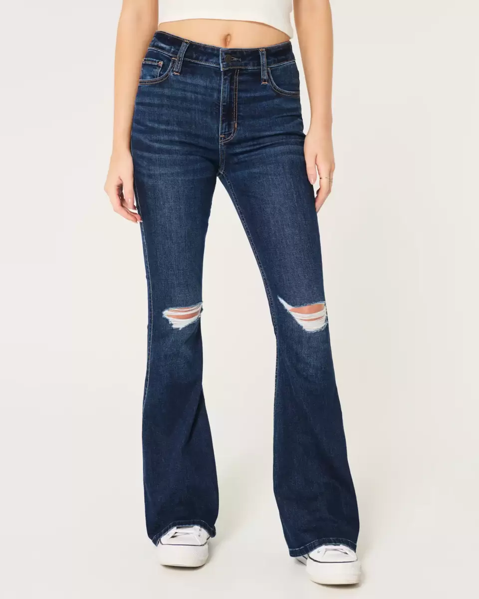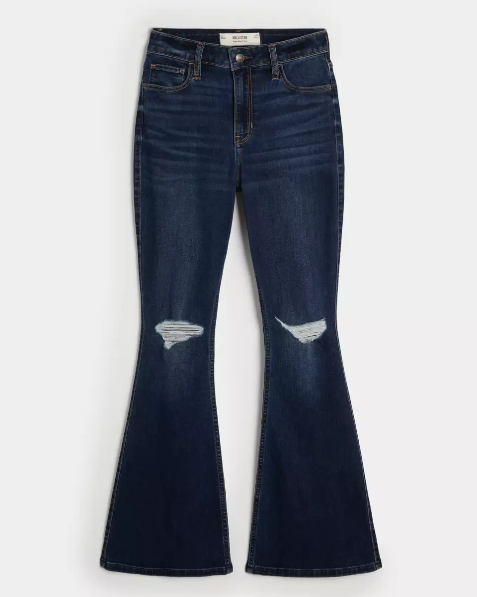 Classic jeans designed with a high-rise waist, slim leg and flared hem. Dark wash denim with stretch, fading, whiskering and ripped details. Imported.